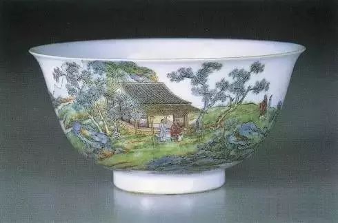 碗内白地无纹,外壁一面画山水人物,背山面水,竹林小屋,一士人坐于屋内,一僮旁侍,屋外桥边二人驻足交谈,一人指向屋内,远山苍润,小桥流水,皴石茂林,烘托出一幅清朗宜人的山水人物图景。