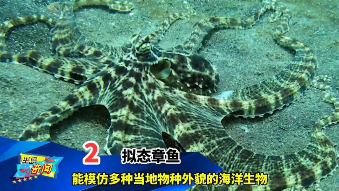 算上触手,这种原产于印度-太平洋的头足类动物大约有60厘米长。拟态章鱼天生具有惊人的自我保护能力。这是迄今为止已知的唯一一种能模仿多种当地物种外貌的海洋生物。它们可以模仿包括狮子鱼、水母和海蛇在内的动物的身体特征。在模仿其它生物的时候,它们的色素囊可以改变皮肤的质地和颜色,使其更好地融入环境,变成掠食者避之不及的有毒海洋动物,确保其能够逃脱掠食者。这种能力并不仅仅用于防御。通过模仿螃蟹寻找配偶的样子,章鱼可以吃掉被骗的螃蟹求婚者。