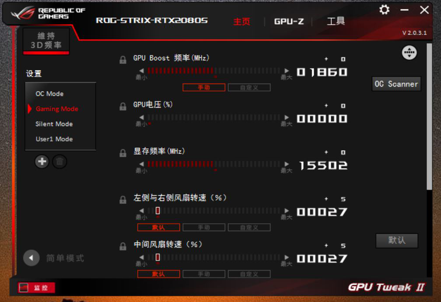华硕自家的GPU Tweak II显卡超频软件提供了相当丰富的超频调节选项,包括GPU Boost频率、GPU电压、显存频率、左侧与右侧风扇转速、中间风扇转速等等,能够满足高端玩家们对显卡的精确超频调节,进一步释放显卡更强的性能。