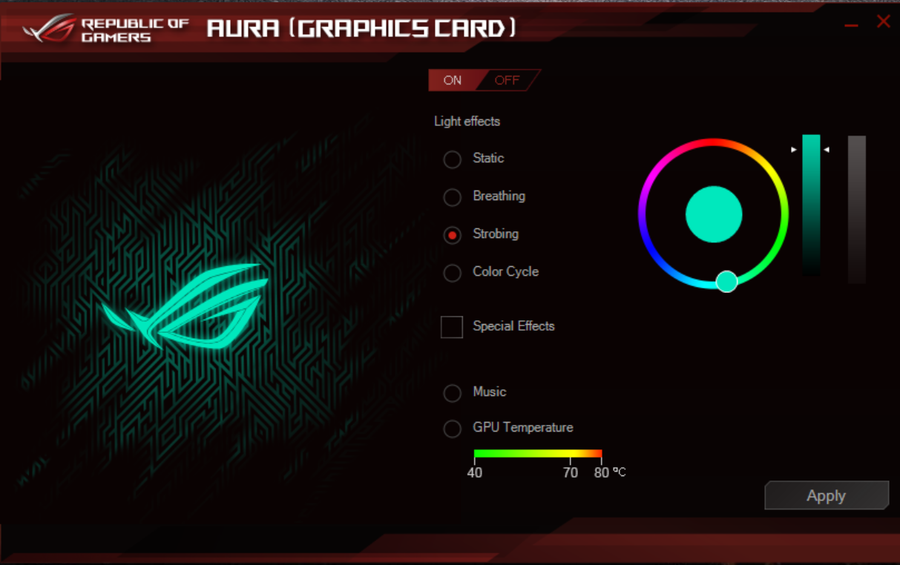 答:在DIY逐渐多元化的今天,一台主机没有“灯”那一定会显得格格不入。而要论“玩灯”,华硕ROG可谓是数一数二。AURA SYNC神光同步技术,自面世以来就收到了广大用户的好评。作为一款华硕ROG的发烧级显卡,ROG-STRIX-RTX2080S-O8G-GAMING自然保留了AURA SYNC神光同步技术,无论是正面还是背板,都配置了大量的RGB发光元素。通过显卡专用的AURA软件,可轻松在多种发光模式下切换,如静态灯效、呼吸、色彩循环、音乐效果等。