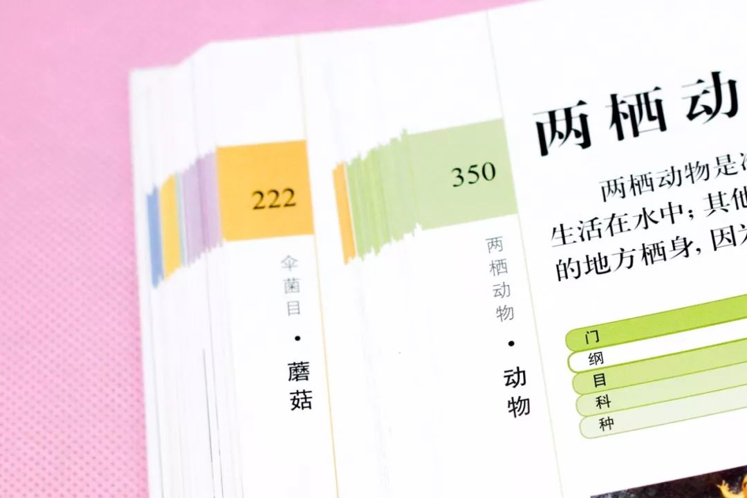 除了内容丰富,这本书的设计也很贴心,在每页的边缘都会标明不同章节的颜色,并且写清是哪个目属,更方便孩子翻看。。。
