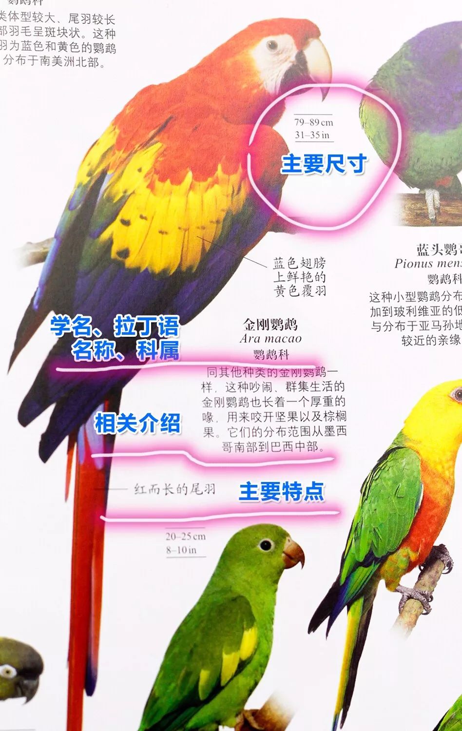 而且对于每一个物种的介绍,这本书也同样会有全面、详尽的解释~~例如以金刚鹦鹉为例,上面不仅写了鹦鹉的学名、科类、拉丁语名称与相关介绍,也写了大致的尺寸,还标识了主要特点,方便孩子们辨认。。。