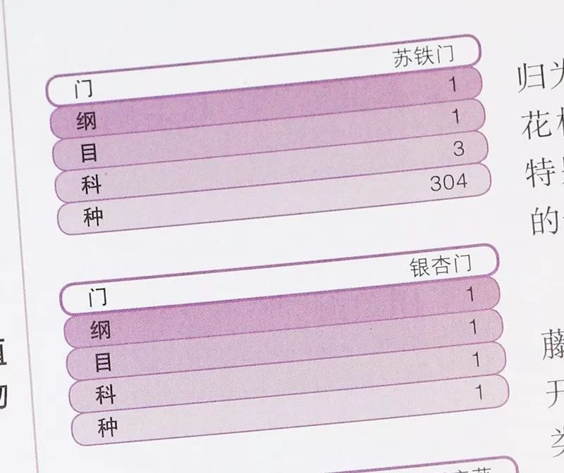 并且在具体介绍每个门的时候,还会进行纲、目、科、种的展示,例如苏铁门植物中,一共会有1纲、1目、3科、304种植物。。。