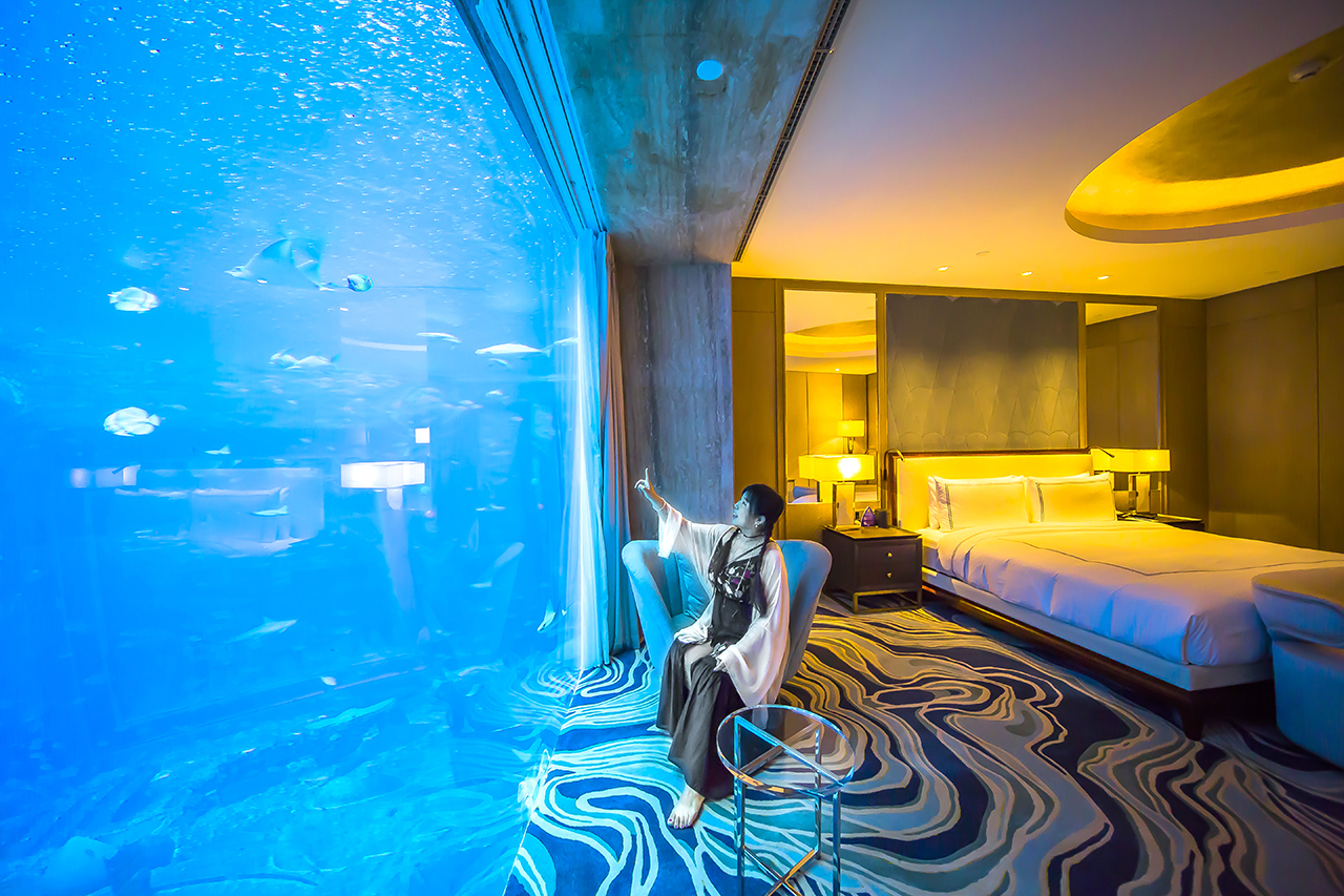 也许10万+太昂贵,被圈粉的“现女友”们也可以考虑一下5w8的尼普顿套房,房间一样拥有巨大的玻璃水底世界,躺在床上就可以看到8600尾珍奇海洋生物在身边游来游去,魔鬼鱼、鲨鱼等等等。一夜都可沉浸于超级梦幻的氛围之中。