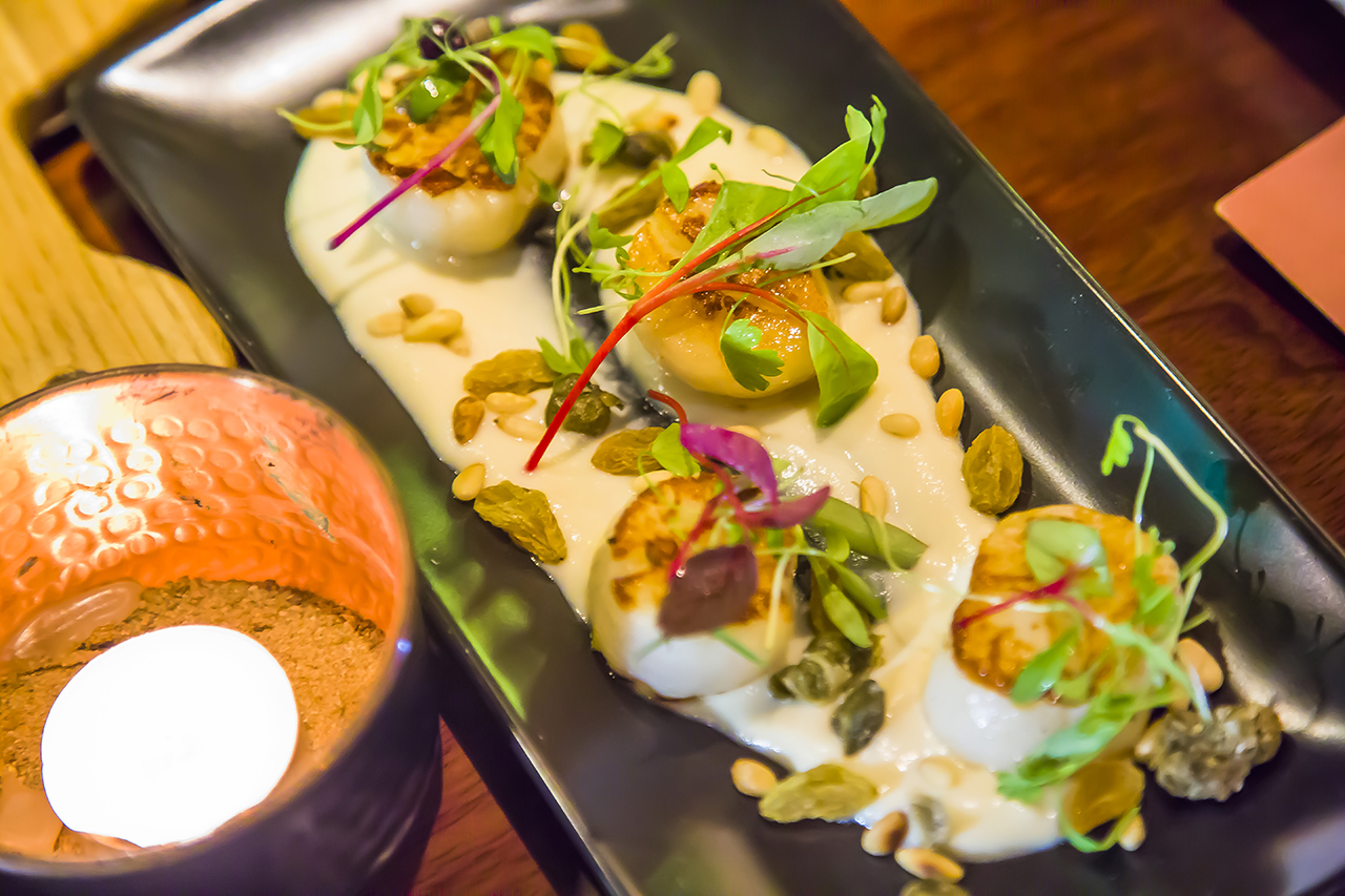 1、餐前面包+三道开胃菜+双主菜+两道甜品+两杯冷饮。其中开胃菜:香煎带子(椰菜花泥,松子,葡萄干,酥脆水谷瓜柳128);椒盐鱿鱼128;烧牛肉薄切五成熟(鹌鹑蛋,金枪鱼酱128)。其中特别推荐香煎带子,肉质饱满椰菜花泥和水谷瓜柳一起的口感是特别有层次感,非常英式的口味🇬🇧很是值得一试。