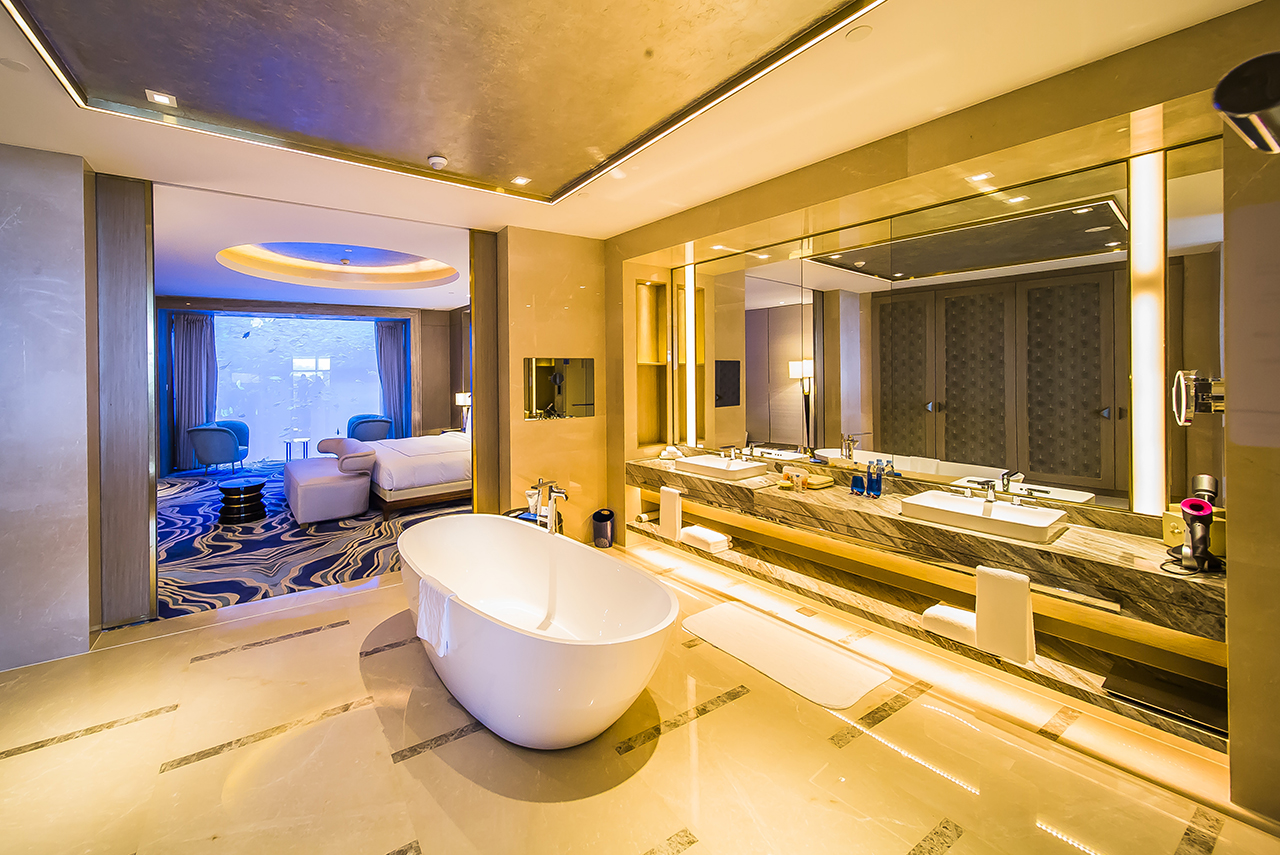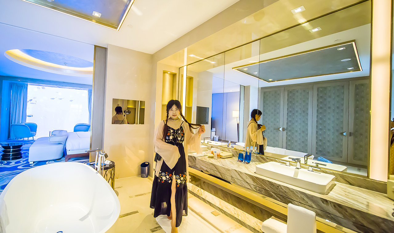 尼普顿套房拥有开放式的洗漱间,洗漱用品是 宝格丽Bvlgari,吹风机是戴森,宽敞明亮十足气派。水底套房都享有专属福利,除了赠送接送机、下午茶鸡尾酒、mini吧等等之外,还能免费畅游水世界和失落空间水族馆。
