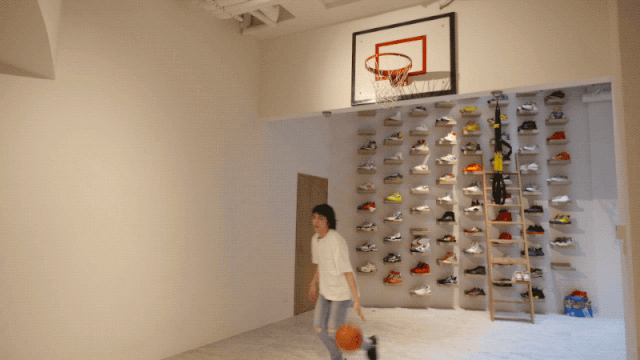 在车库后边是小型篮球场,后边是一面放鞋的墙,大概有一百双,因为要是装鞋柜的话,那家里大概都是鞋柜了。