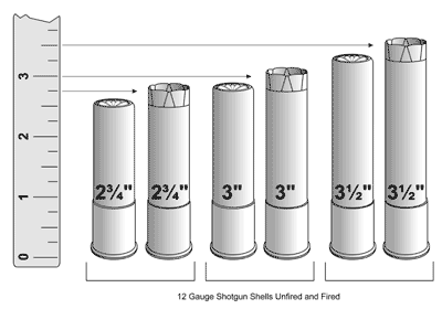 而霰弹相同口径也有不一样壳长的,反正霰弹枪都是直筒的滑膛,而且壳头间隙也都定位在底缘上,因此长短通吃。比如下边都是12号口径,但子弹上一般还会标注壳长,比方3-1/2''就是指说明壳长3.5英寸(8.8cm左右)