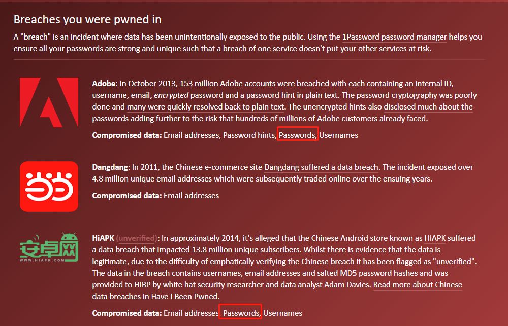 对于我的邮箱来说,Adobe,以及安卓网论坛可能就是那次泄露密码的元凶了,密码就这样在暗网、社工库被兜售的吧。当然,其实还有一些数据泄露悄悄的就在暗网交易了,HIBP并不一定就收录了。