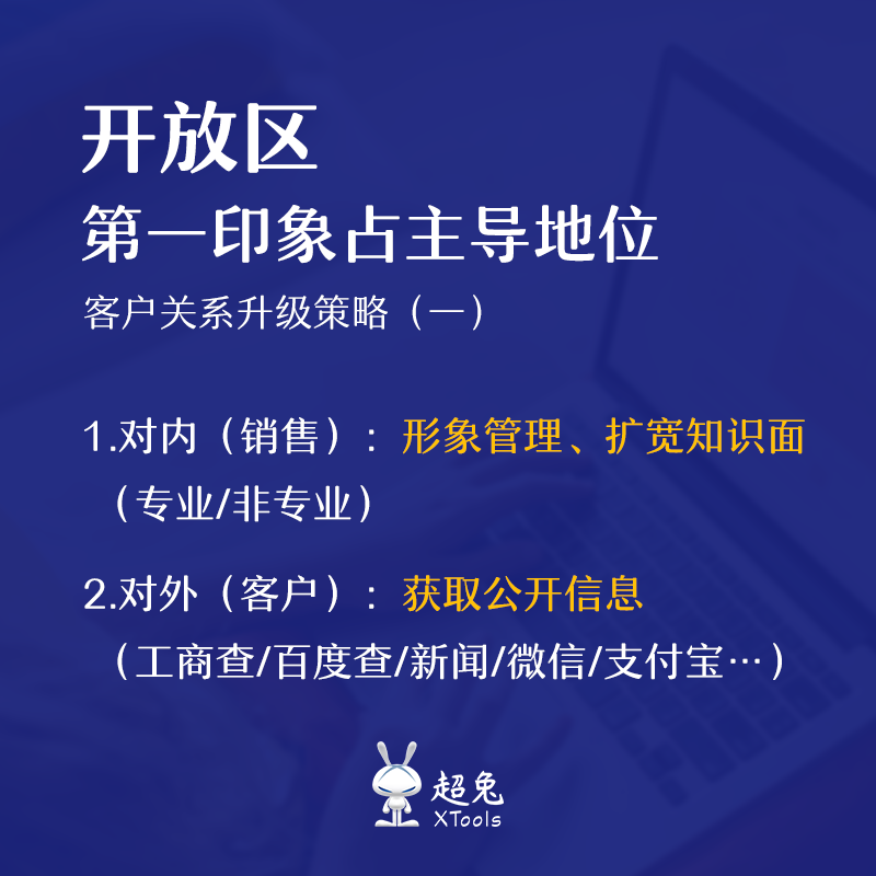 人际交往中第一印象尤其重要。第一印象也叫首因效应,是人与人第一次交往中给人留下的印象,在对方的头脑中形成并占据着主导地位的效应。由于开放区信息的公开性,销售可以通过2个角度升级来推进与客户的人际关系交往:
