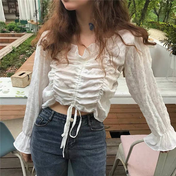 这一款同样是抽绳的设计,但是材质不同,这一款是柔软的衬衫材质,喇叭袖和花边的设计显得特别的温柔,性感又甜美~真的是一举两得呀。