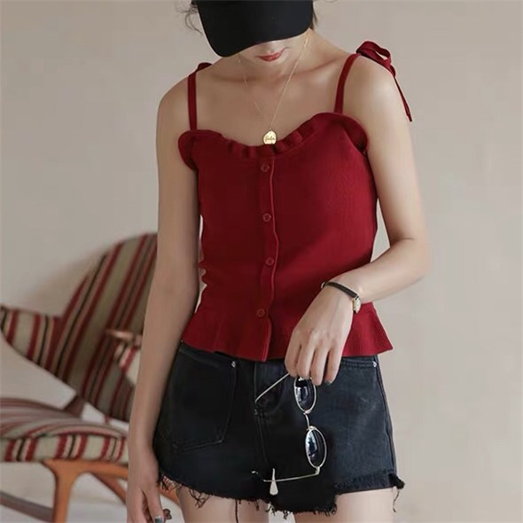 除了上面两款抽绳设计的,还有这一款针织面料的吊带露脐装也特别好看,穿着超级有气质,复古又时尚,小裙摆的设计也是很温柔啦~