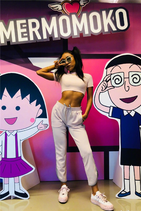 第三款:紧身高领露脐短袖,紧身短袖很好的勾勒出了身体的线条,很有线条美,这一件给人的整体感受相比前面两件,不仅性感而且还很俏皮可爱,扎着双马尾和卡通人物合影留念真的是元气满满呢。
