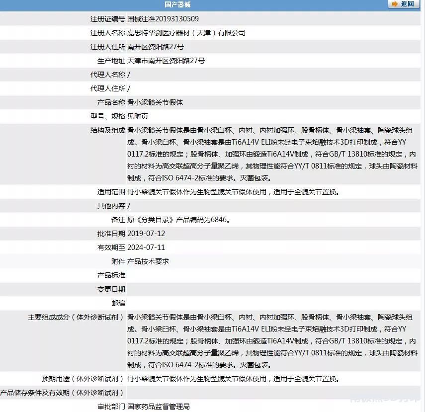 据了解,2019年7月12日,嘉思特医疗自主研发的3D打印骨小梁组髋关节假体系统通过国家药品监督管理局(NMPA)审批(注册证号:国械注准20193130509),产品全称为“骨小梁髋关节假体”,该产品由由骨小梁臼杯、内衬、内衬加强环、股骨柄体、骨小梁袖套、陶瓷球头组成,嘉思特医疗开发了3种型号的3D打印髋臼杯,均采用电子束熔融3D打印(EBM)制造,“骨小梁髋关节假体”产品成为继北京爱康宜诚医疗之后,又一家获得 3D打印髋关节植入物医疗器械注册证的中国骨科医疗器械制造商。