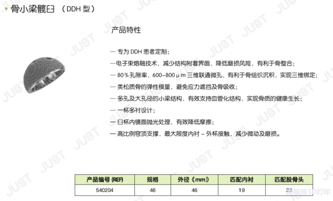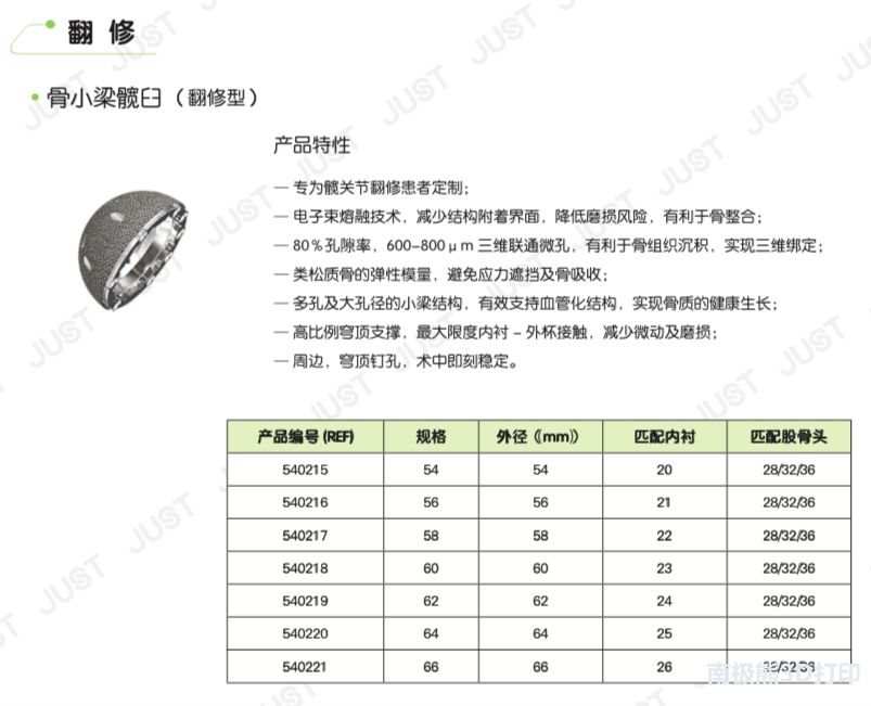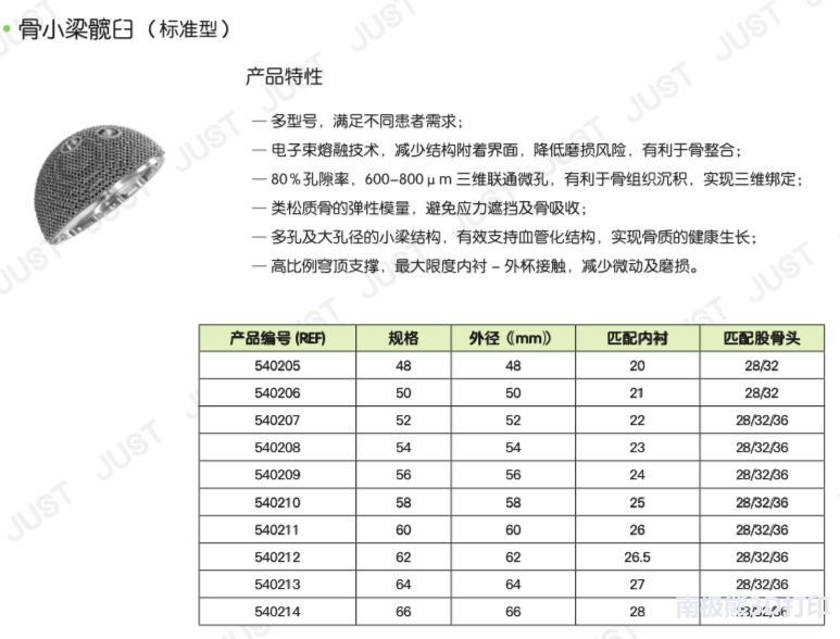 据了解,其中,骨小梁臼杯、骨小梁袖套是由Ti6A14V ELI粉末经电子束熔融技术(EBM)3D打印制成,符合YY 0117.2标准的规定,嘉思特开发了3种型号的3D打印髋臼杯:骨小梁髋臼-DDH、骨小梁髋臼-标准型、骨小梁髋臼-翻修,均采用电子束熔融3D打印(EBM)制造。