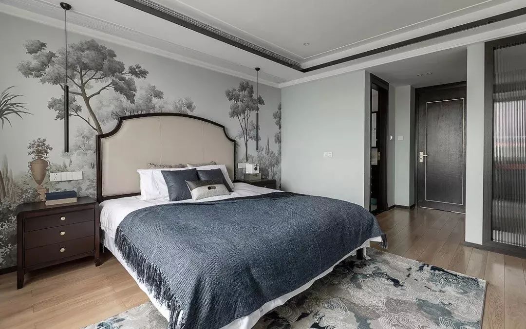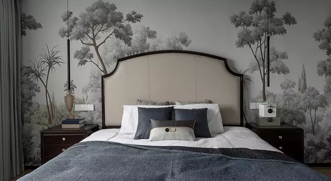 卧室超级好看,头一次见这么有韵味的高级灰空间,地毯和背景墙有点呼应的效果,像是在丛林中栖居,亲近自然的舒适感。