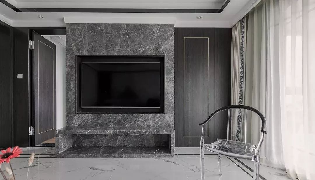 电视背景墙本来不大,将一侧卧室门做成隐形门,另一侧做了对称装饰,中间用大理石砌了电视柜,整个墙面得到延长,空间显大不少。