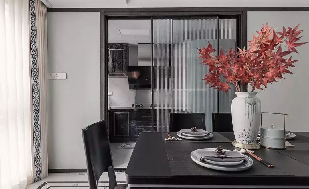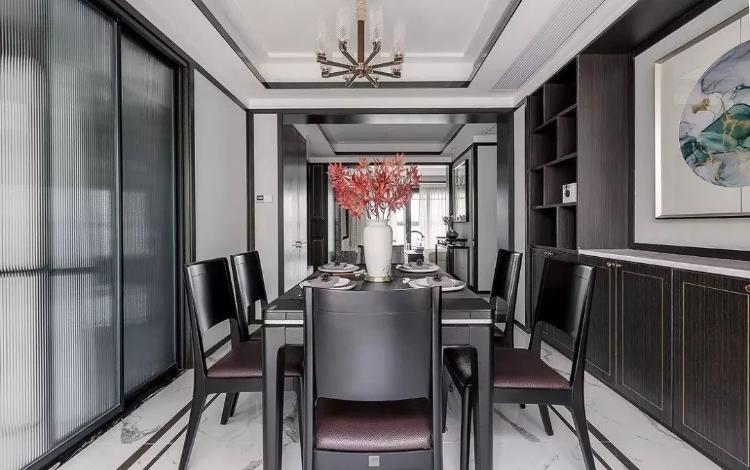 餐厅在玄关的另一侧,深木色稳重端庄,尽显大家风范,桌上一束红枫叶,为空间增色。