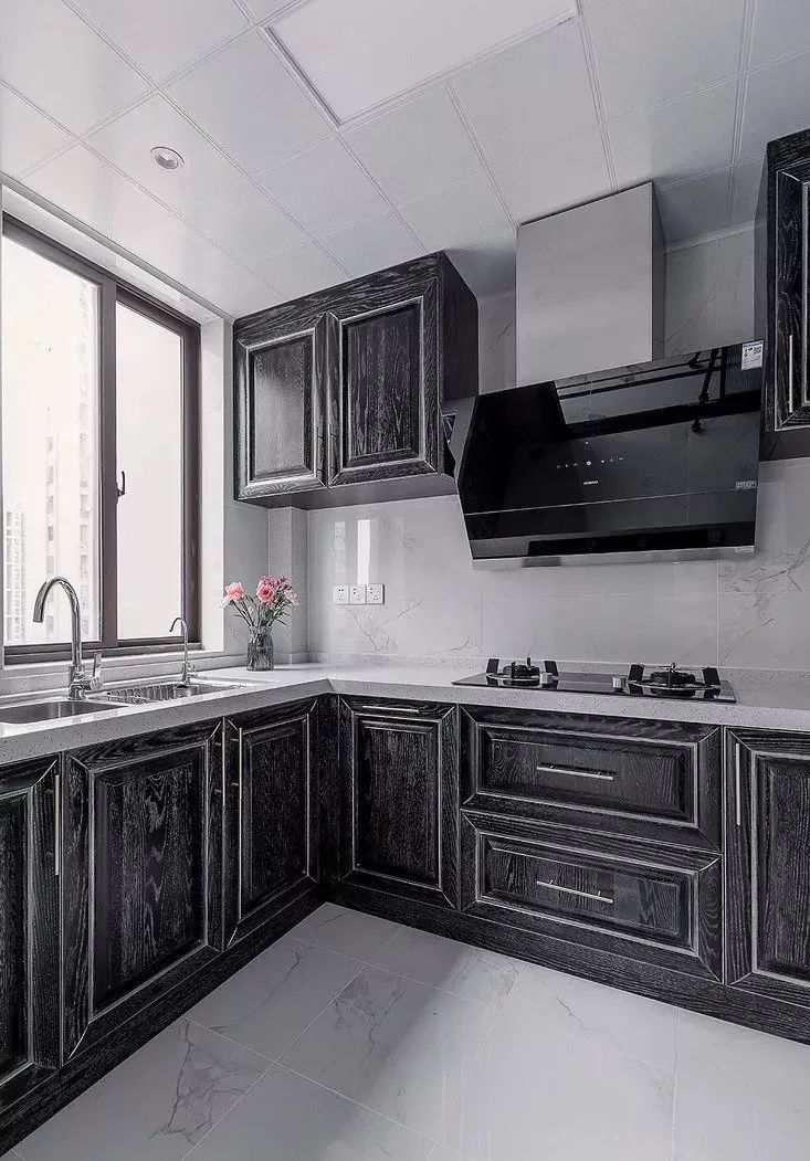 厨房的黑色木纹橱柜超级酷炫,纹路设计缓解了沉闷,浅色瓷砖搭配增加明亮。