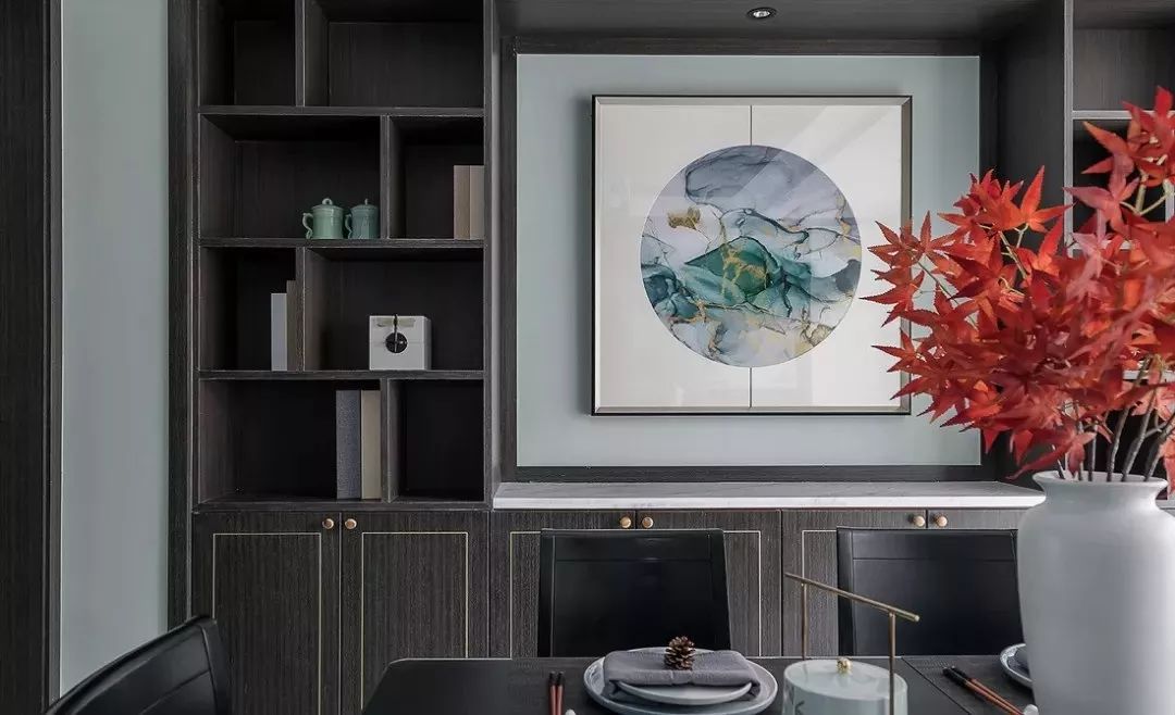 餐边柜做成了嵌入式,中间留空放装饰画,两侧是开放式展柜,下边柜门和电视墙做了呼应。