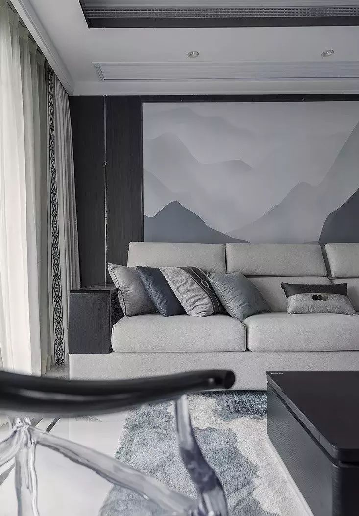 客厅采用高级灰色调,浅灰色L型布艺沙发,正好填满客厅,朦胧的群山背景画,渐变的灰色,意境深远。