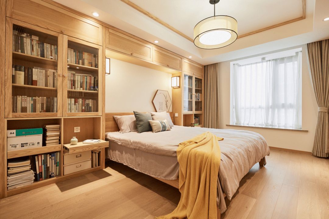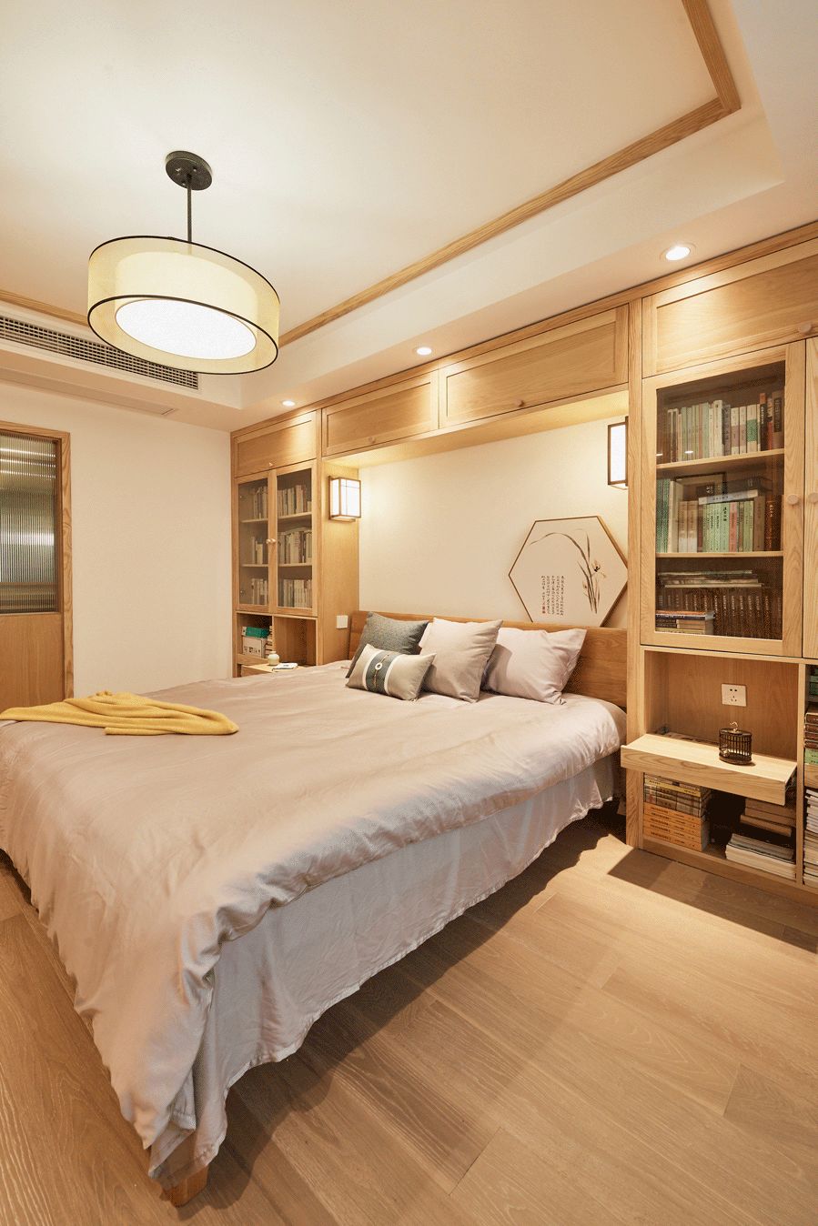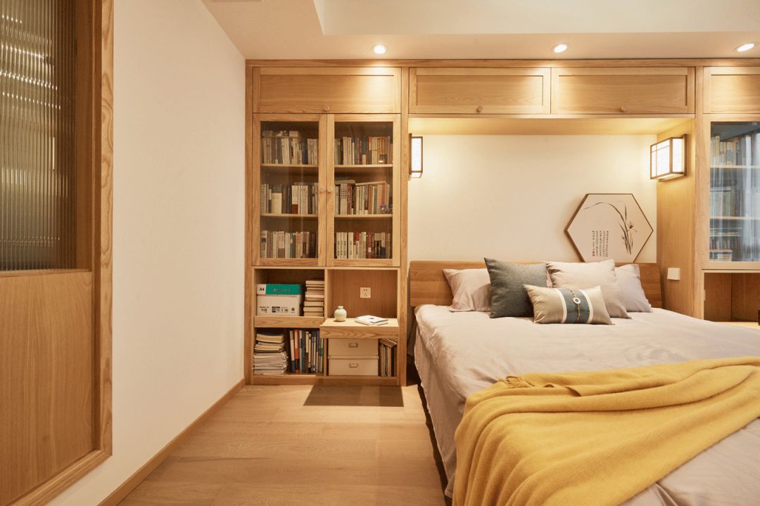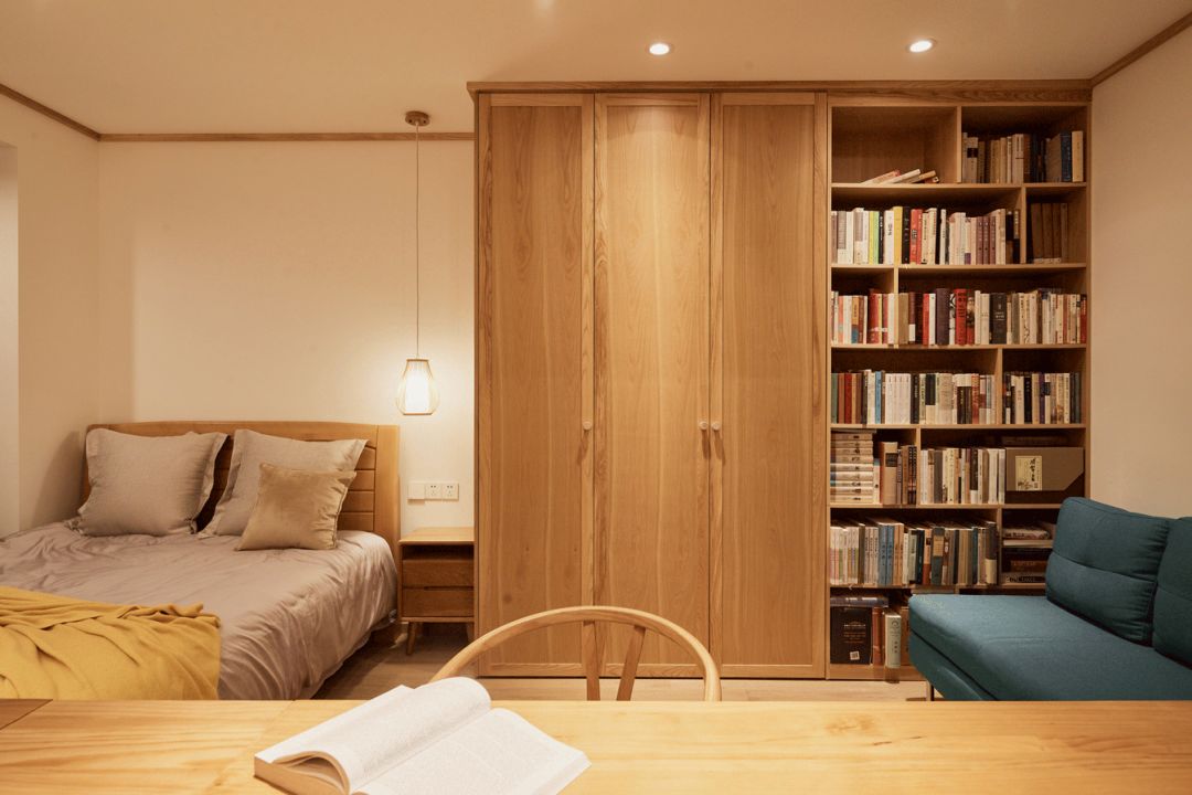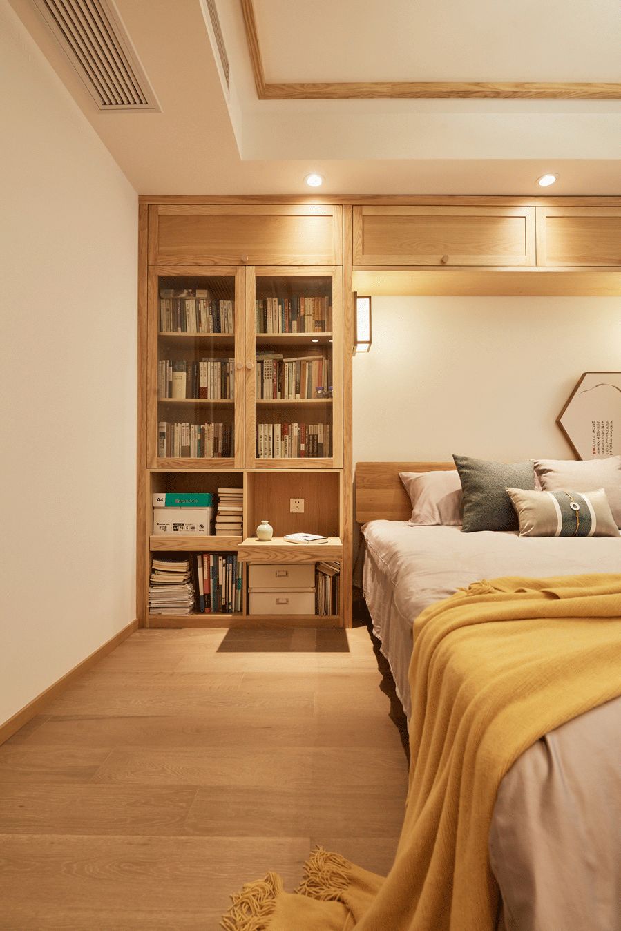 床铺两边的书柜,各自留出一层板抽拉式设计来充当床头柜,空间限制下的创意之举是亮点之一。
