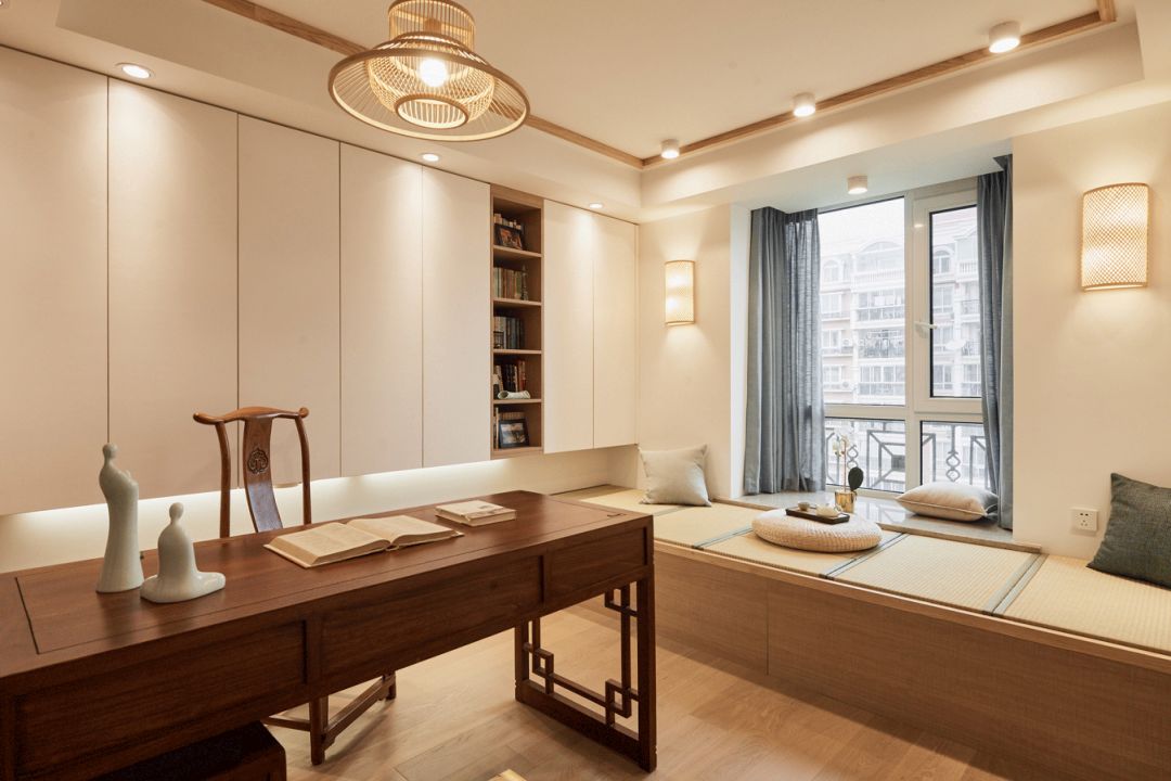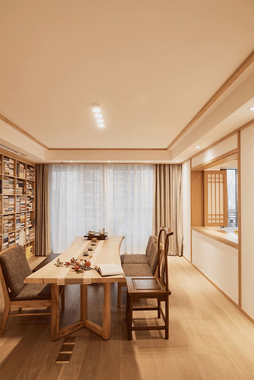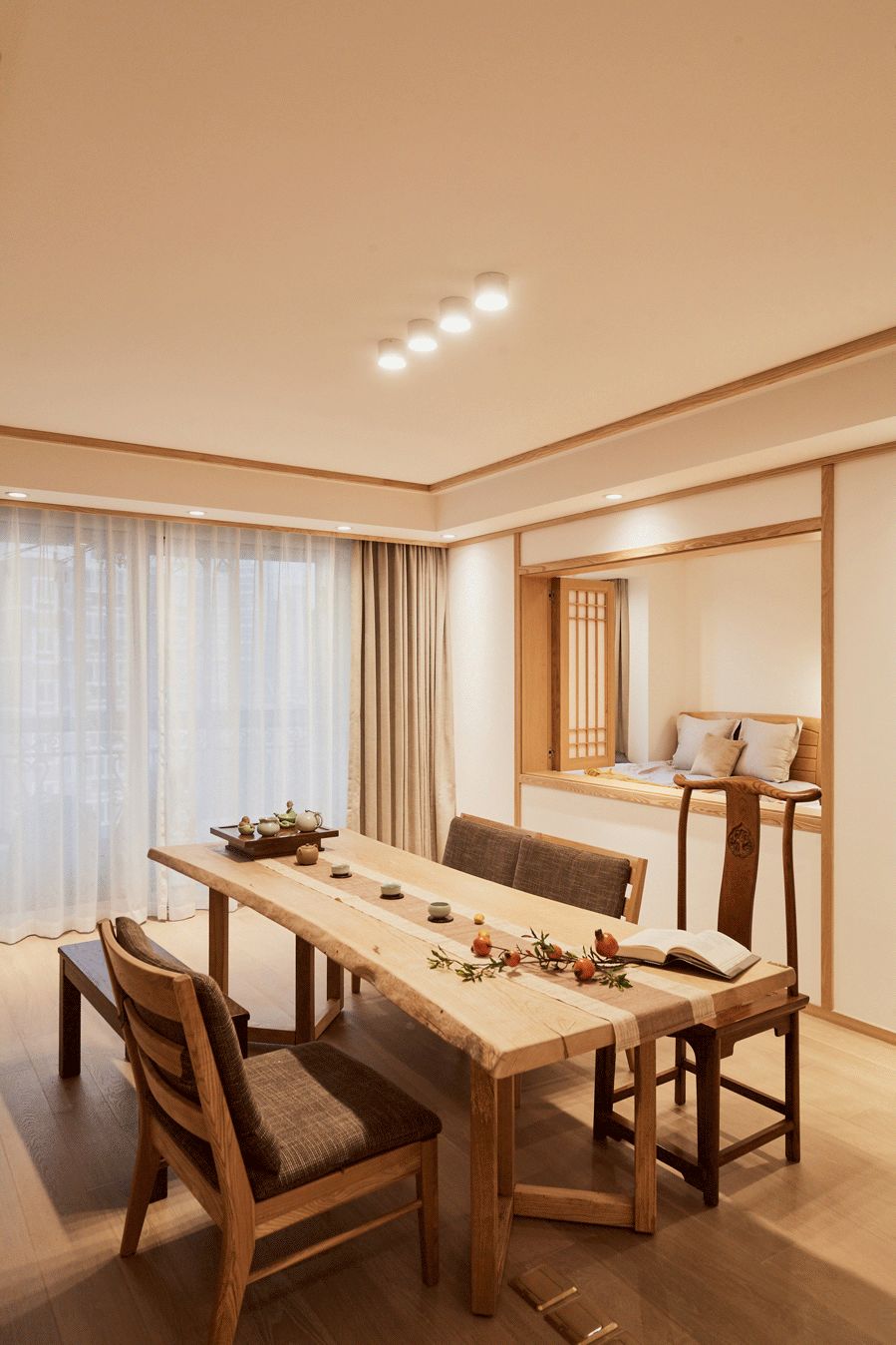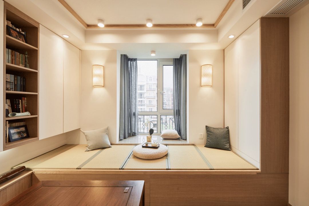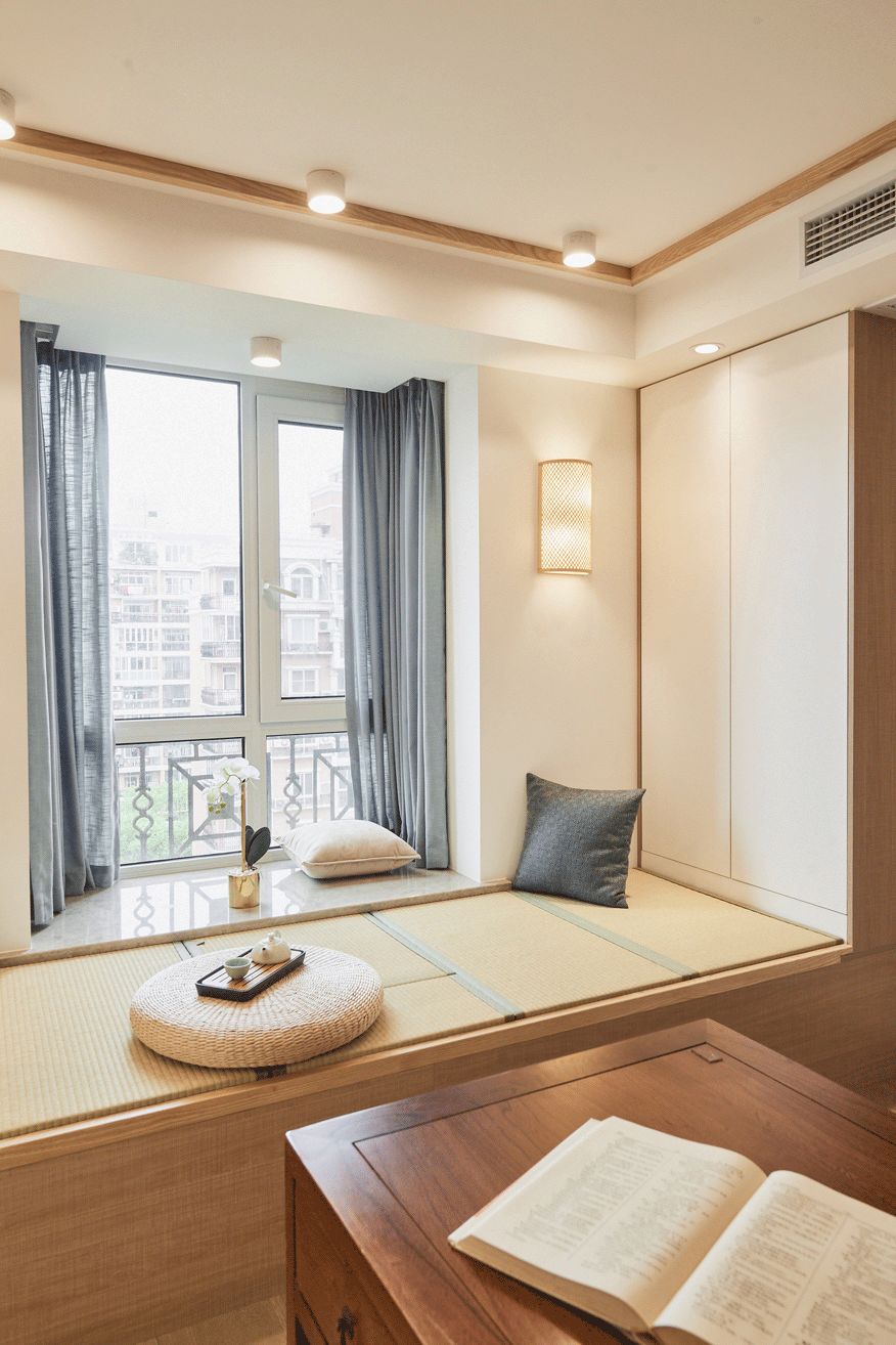 1.2米的榻榻米是房间采光的最佳位置,内藏升降桌设计,调整到合适高度可兼顾打坐、喝茶、聊天、听音乐、弹古琴等多种功能。