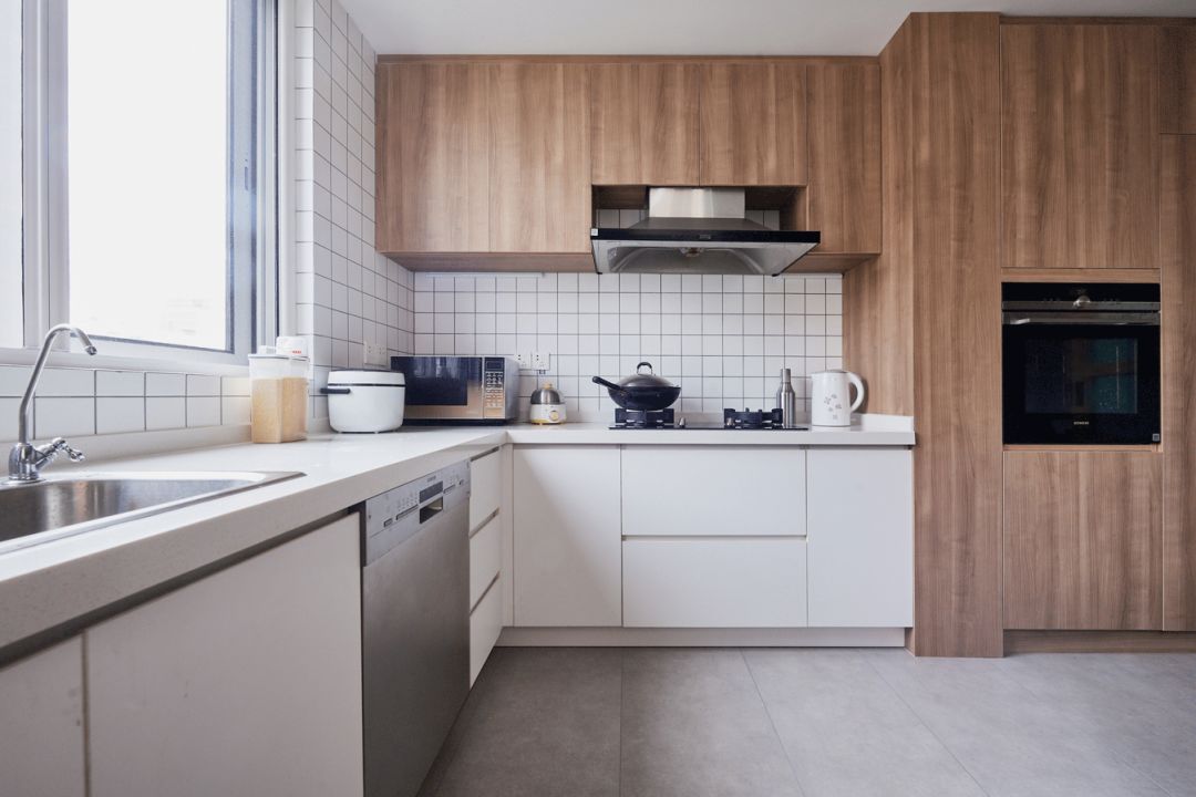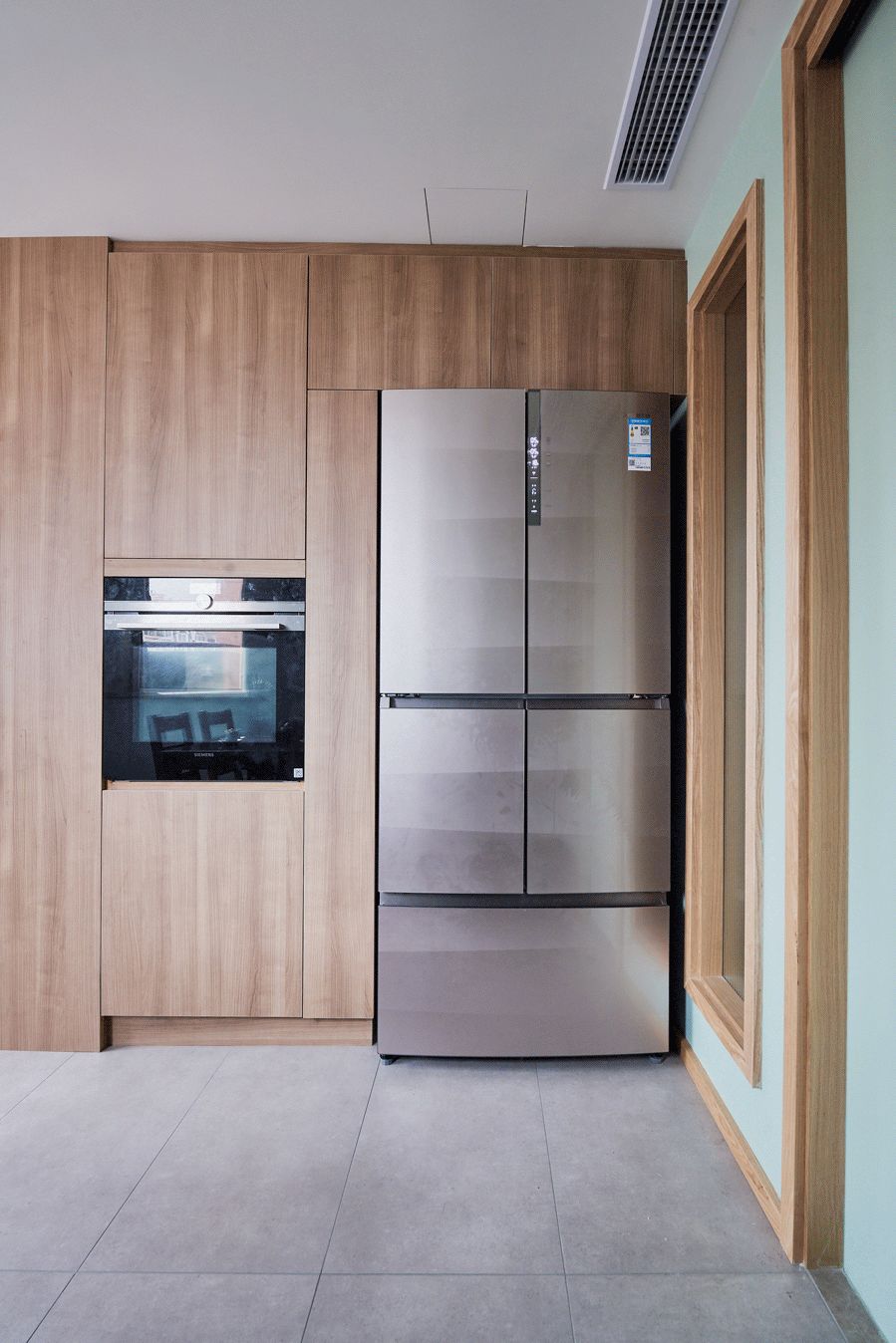 一体化的橱柜收纳让厨房整洁,留出冰箱和其他电器的空间,便可减少高低不平的凸起物,同时增加了空间的开阔感。