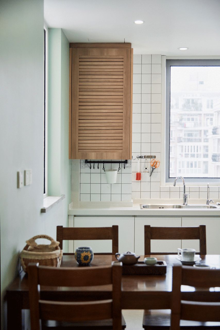 房子南北通透的格局非常难得,于是在门厅与厨房间的墙上增加一扇“窄窗”,长虹玻璃可透入北面厨房的光线,即使白天不开灯也十分明亮。