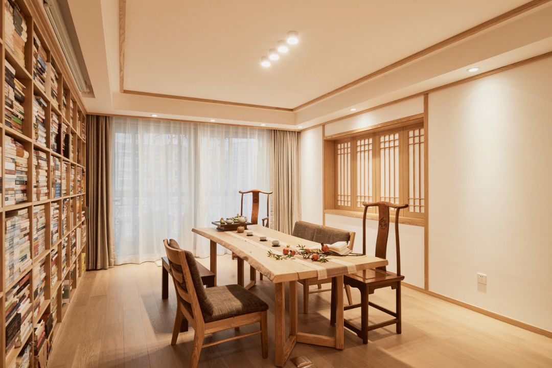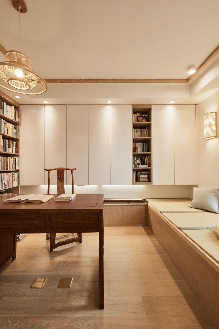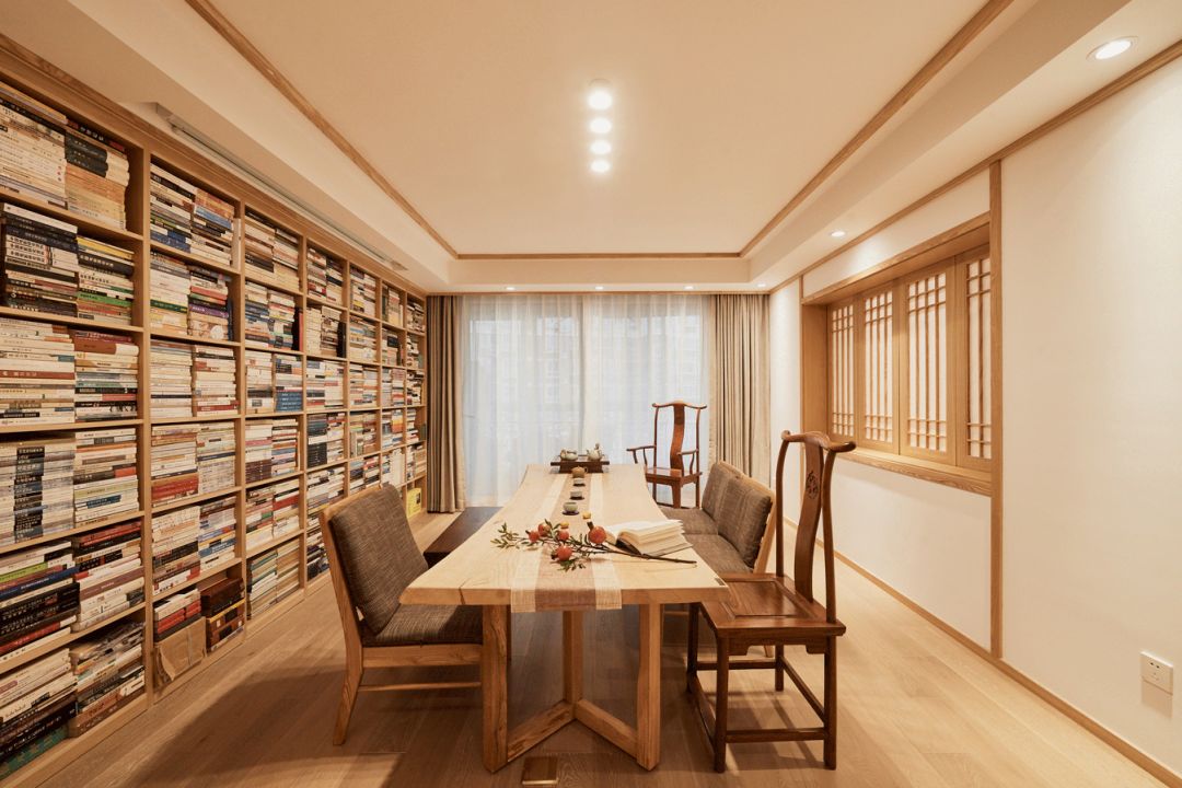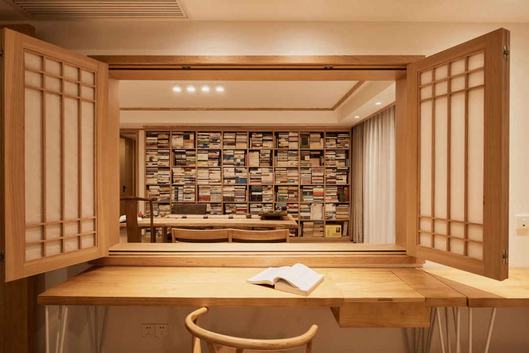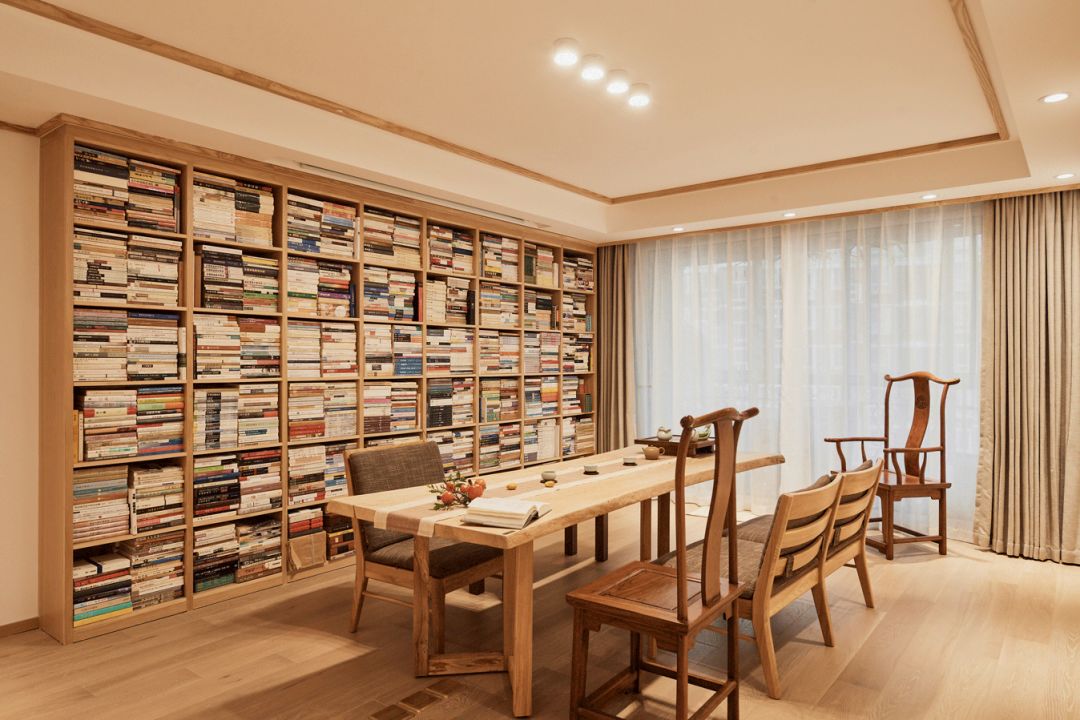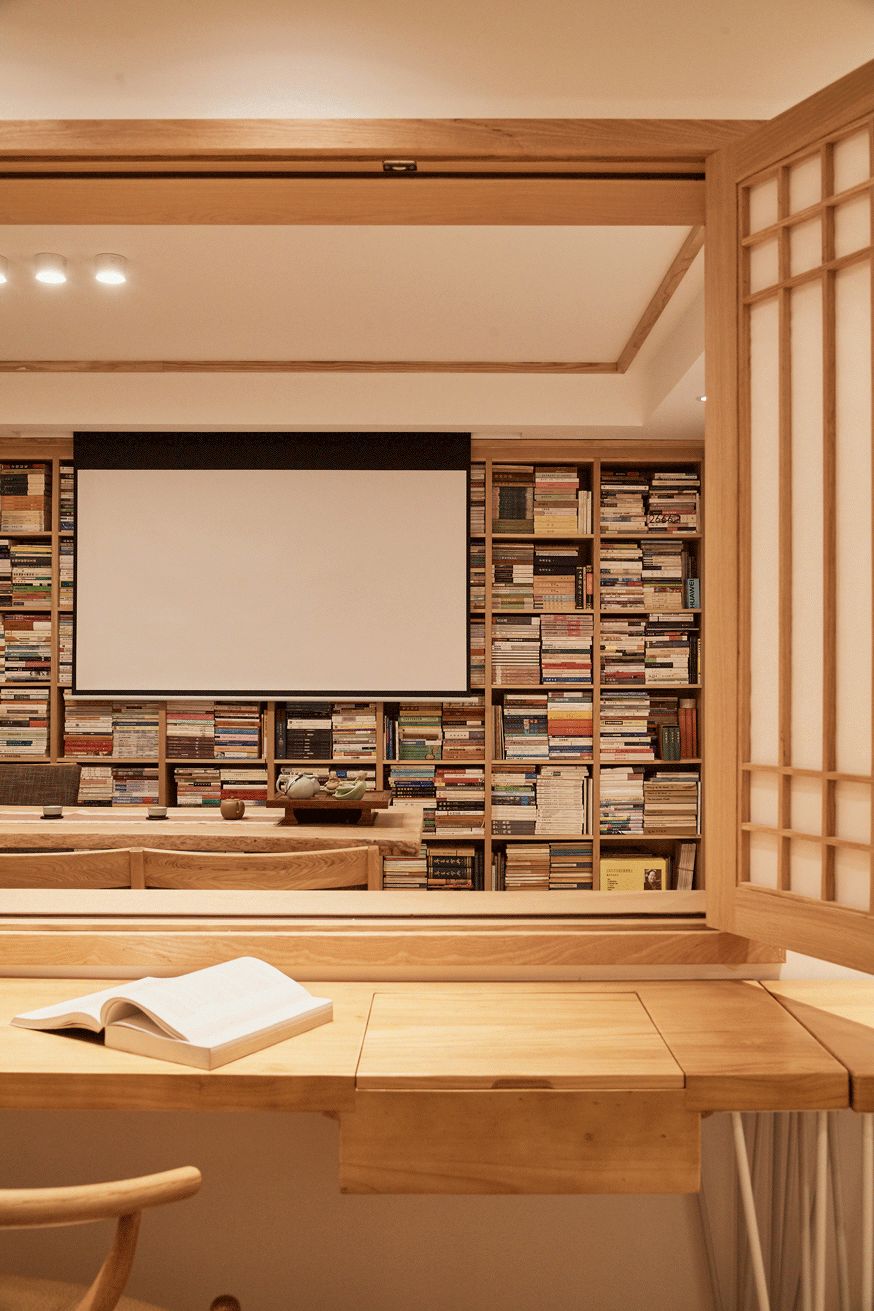 推开书房的大门,一股清风来去自如,生出外部自然光与内部灯色交织流传的美感。