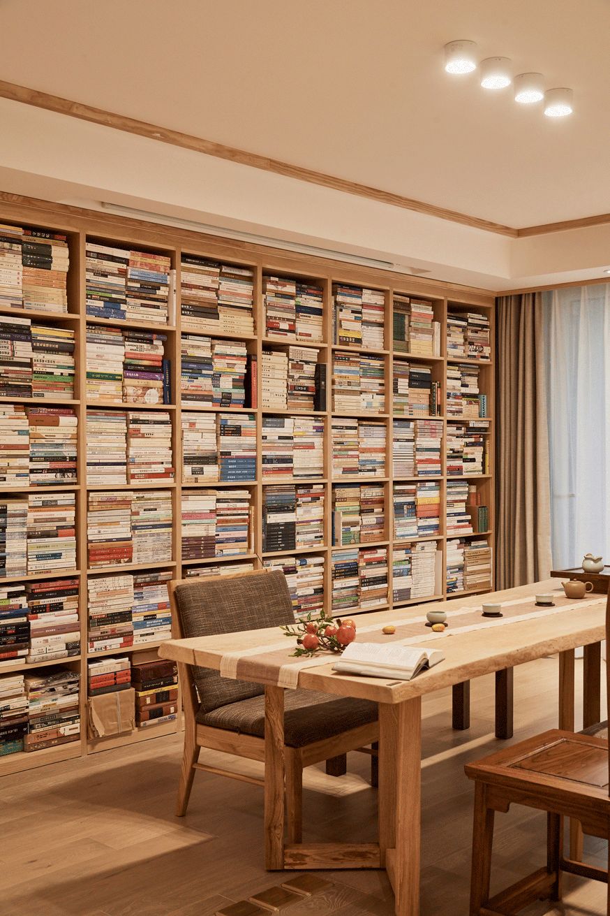 两位教授共有上万本书籍,因此将客厅变成“大书房”,选择了顶天立地的大书架+超长书桌的格局。
