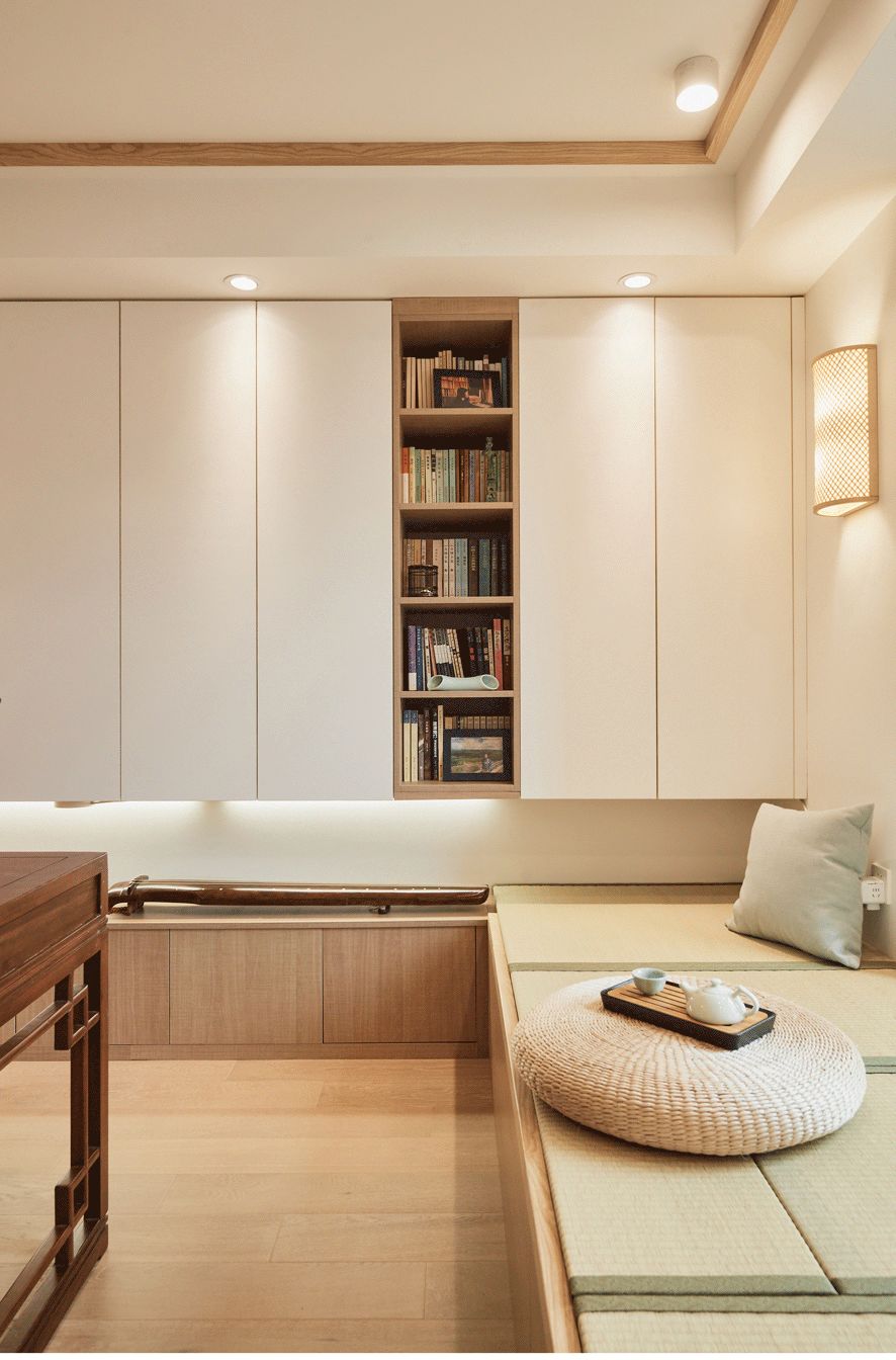 榻榻米转角的墙面,看上去平淡无奇的白柜书墙却内藏乾坤。