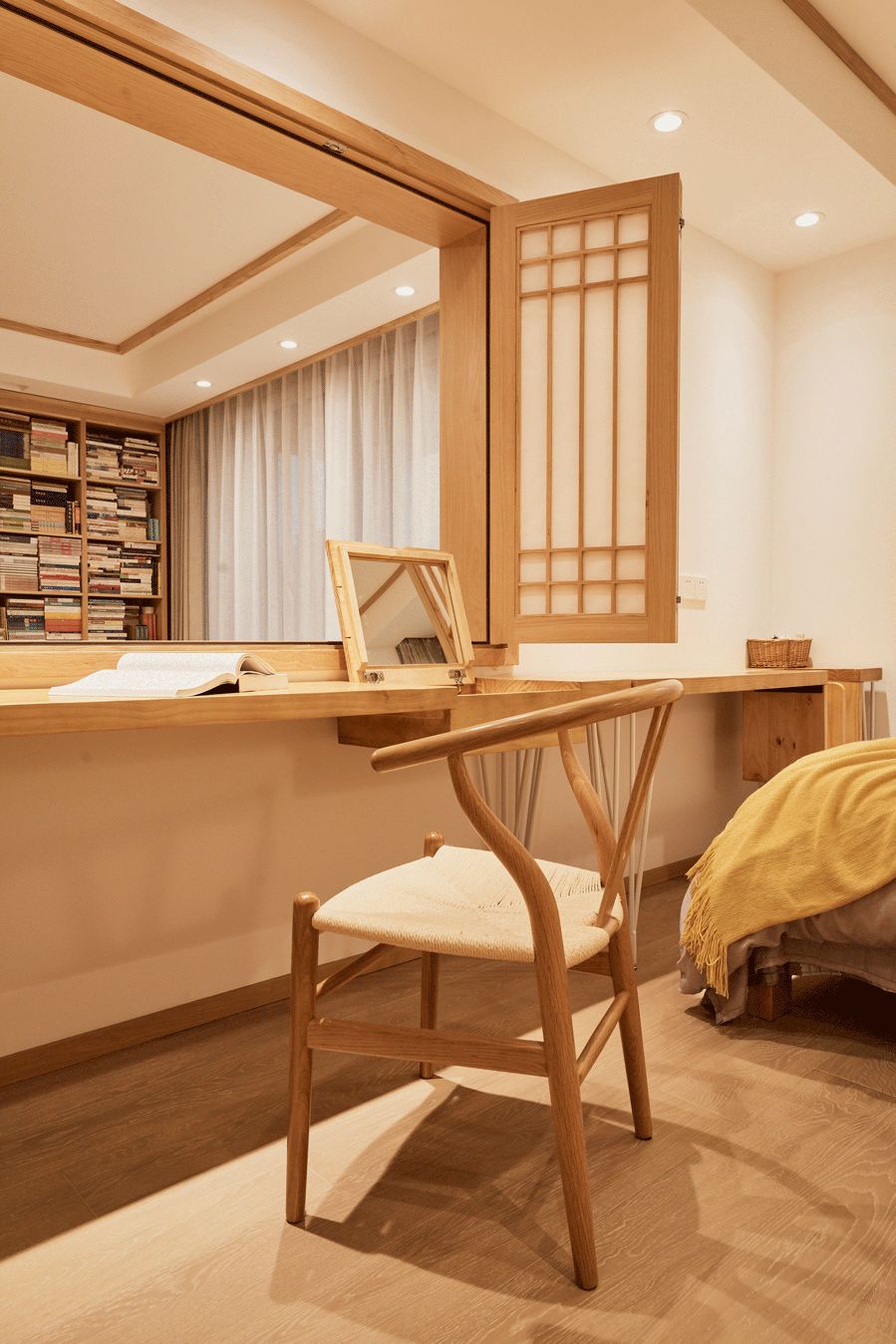 次卧的窗台糅合了书桌与梳妆台的功能,右边的桌面上暗藏着一块可以翻起来的镜子。