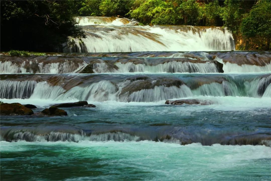 68级跌水瀑布、拉雅瀑布如银链般泻下