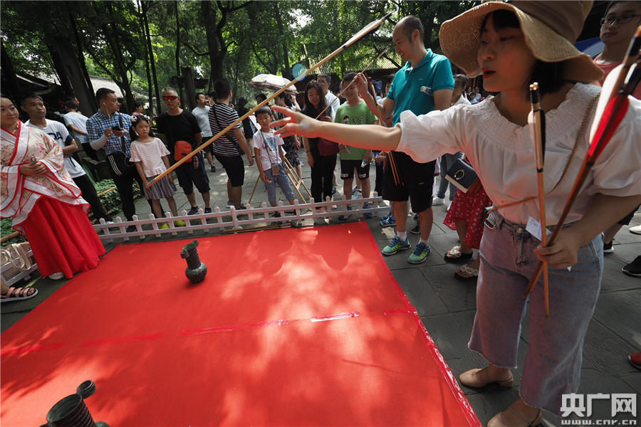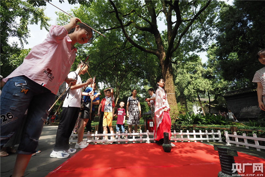 进行展览的同时,在成都武侯祠博物馆三国文化陈列室前还举行了一场别开生面的“三国运动会”。20名身着汉服的小小讲解员与来自全国各地的博物馆观众共同参与包含投壶、射礼、五禽戏、蹴鞠的互动游戏。