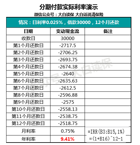 9.41%的年利率,在分期还款里的不算高。要知道信用卡分期的日利率一般是0.05%,那年利率高达18.82%。