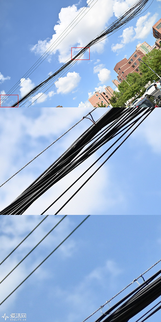 在腾龙官方介绍中,着重介绍了SP 35 1.4没有一般大口径镜头走红常见轴向色差与画面边缘彗尾眩光,那实际表现如何呢,可参考下面组图。第一组照片是镜头全开光圈,拍摄蓝天作为背景的电线,照片RAW格式拍摄,使用捕影工匠处理,关闭横向色差、纵向色差在内所有校正选项。照片中心的电线边缘完全没有产生色散,边缘的电线有着轻微的绿色色散,SP 35 1.4实拍场景下色散控制相当的好。