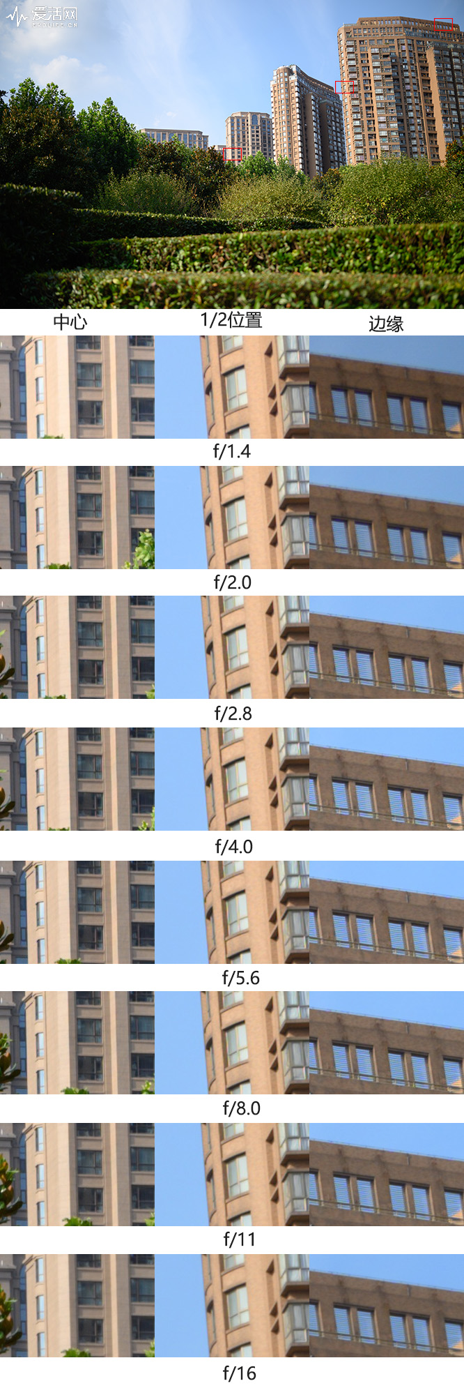 在望远状态下,SP 35 1.4全开光圈中心、1/2位置已相当不错,只有边缘解析力较弱,基本与MTF反应一致;在收缩一档光圈厚,镜头分辨率急速提升,变得非常锐利,再收缩一档光圈后(f/2.8)边缘会变得非常锐利,最佳光圈出现在f/4.0,最小光圈f/16时分辨率会略微降低,大致与f/1.4下持平,所有光圈都没有明显的像裂。