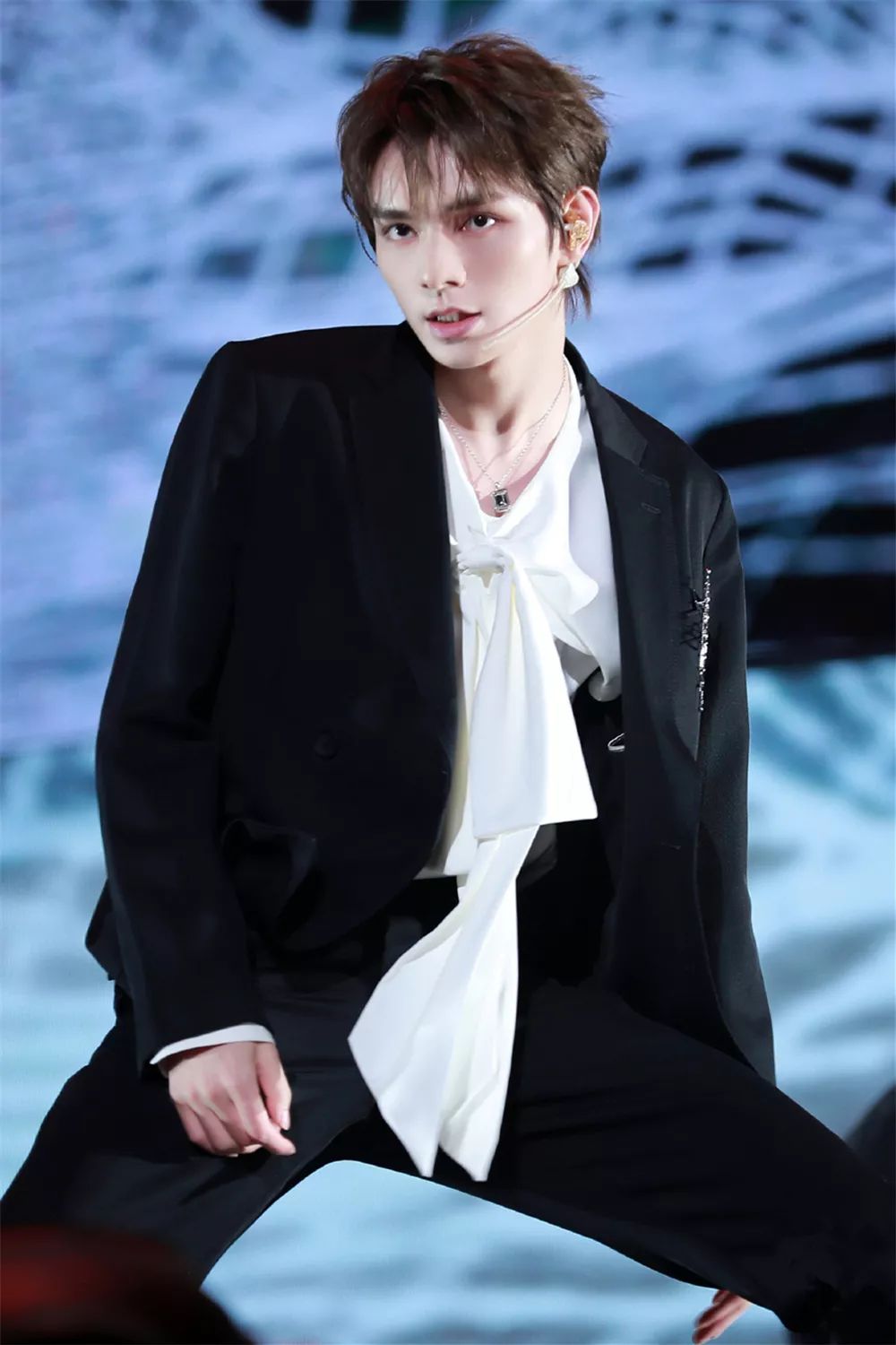 第四名的管栎,我一直觉得他应该走儒雅公子路线,毕竟这文质彬彬的气质就摆在那儿,怎么看都觉得很有魅力。纯白色的衬衫搭配纯黑色的修身西装,管栎将一身经典黑白配诠释得利落又干脆。其实这身造型不光是适合演出,下了场去开个会都是完全可以的~