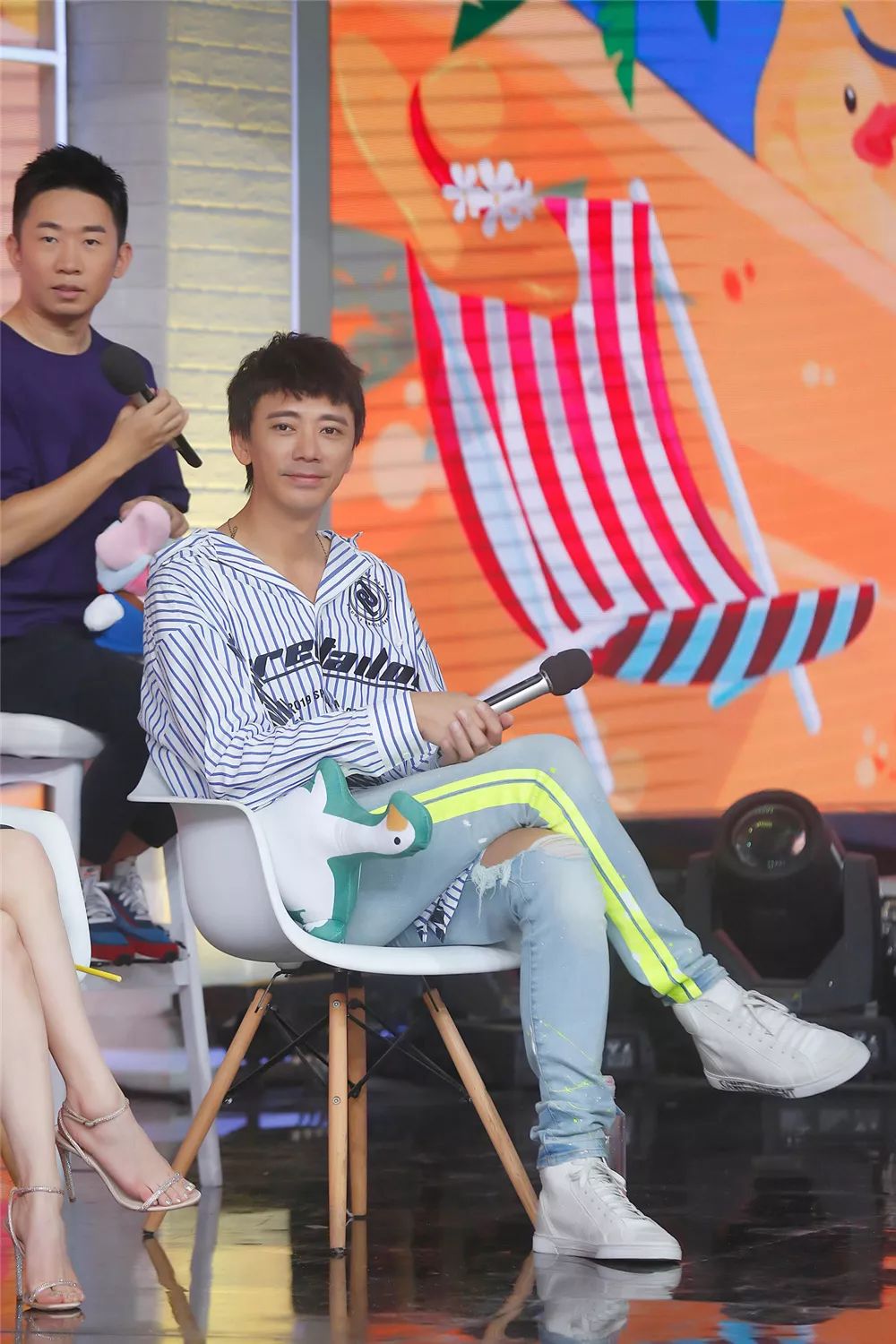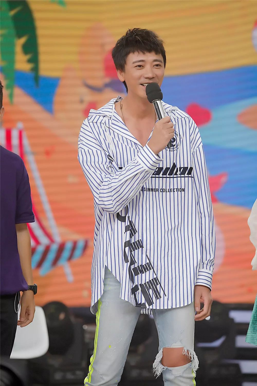当然啦,做客节目,信打扮得还是蛮讲究的,把头发捋顺,整个人看起来精神不少。上衣已经穿得够帅啦,下搭一条破洞裤,更是让他潮感爆表,稍微用毛边修饰一下,是不是个性很突出?
