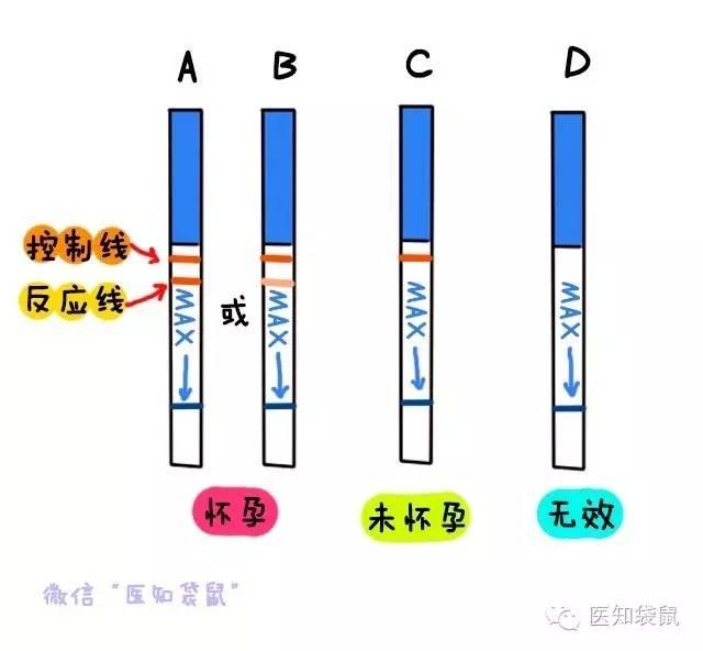 B:可能怀孕 第二道红杠对比对照线颜色浅,需要隔两天用新试纸重新检测;