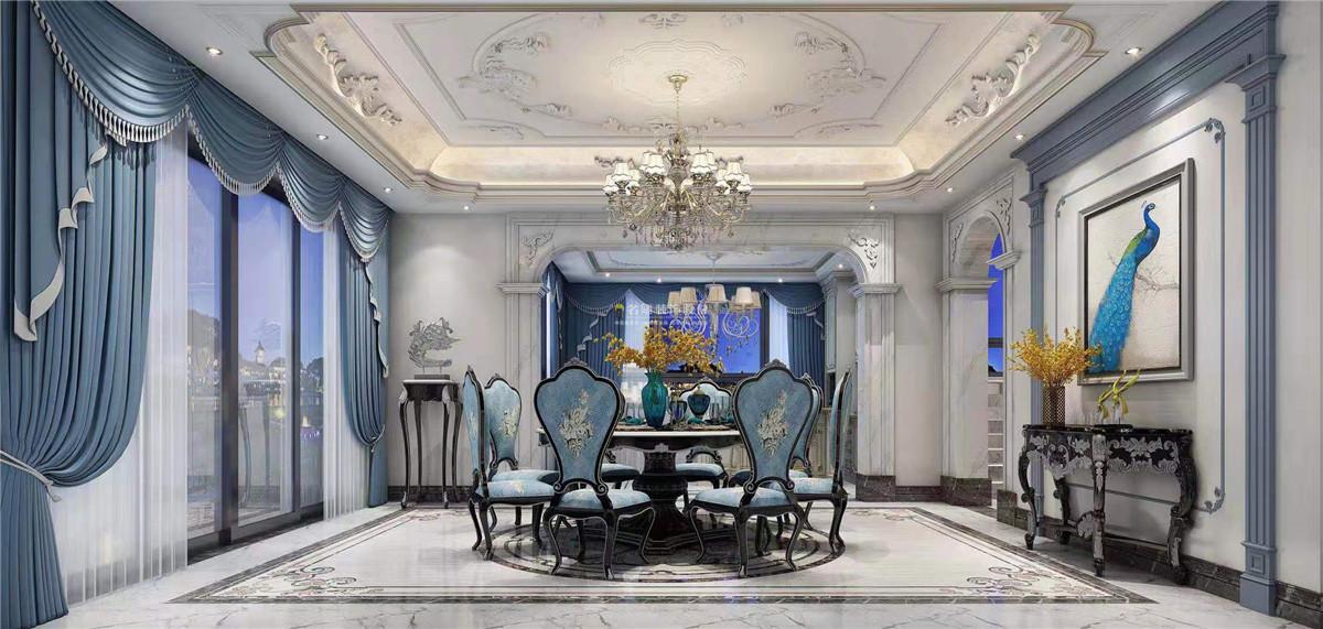 餐厅秉持典型的法式风格搭配原则,窗帘、餐桌和餐椅均为海洋的蔚蓝色,餐桌家具表面略带雕花,显得优雅矜贵。在卷草纹窗帘、水晶吊灯、落地灯、瓶插鲜花的搭配下,浪漫清新之感扑面而来。