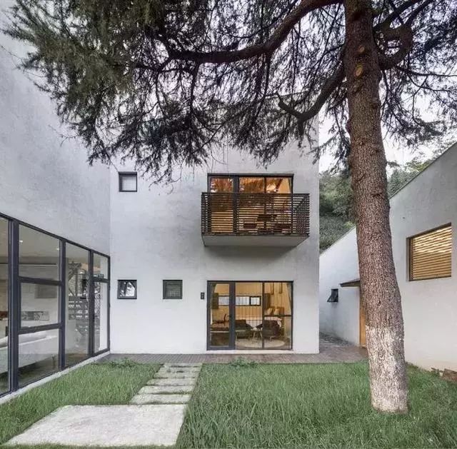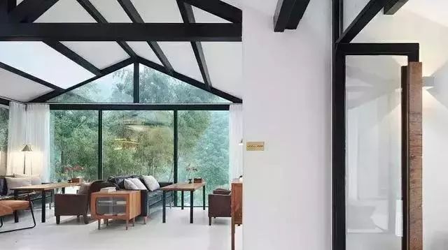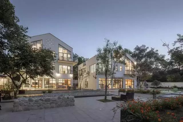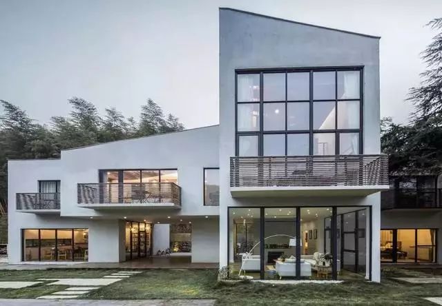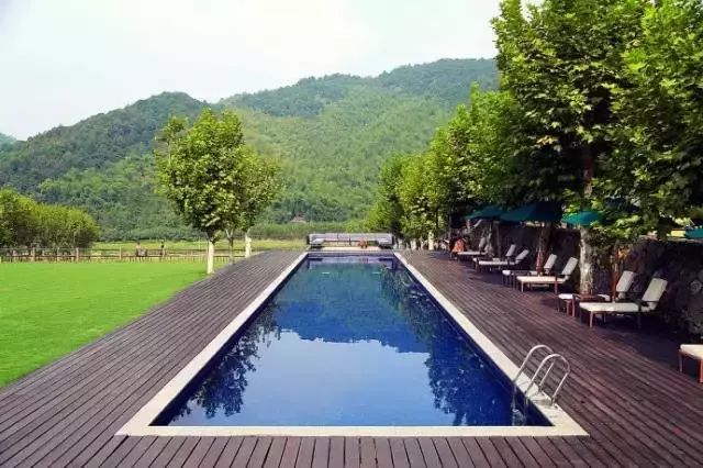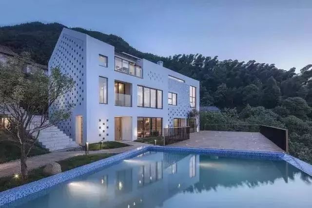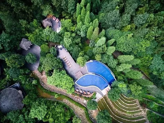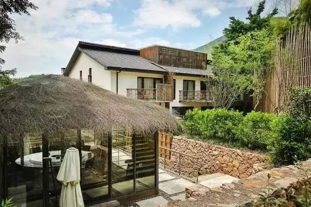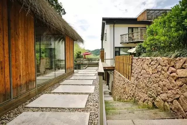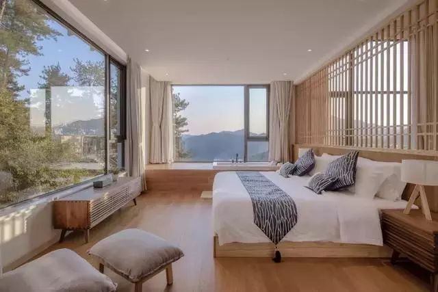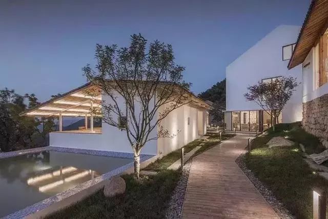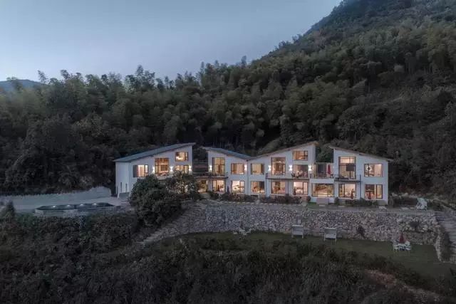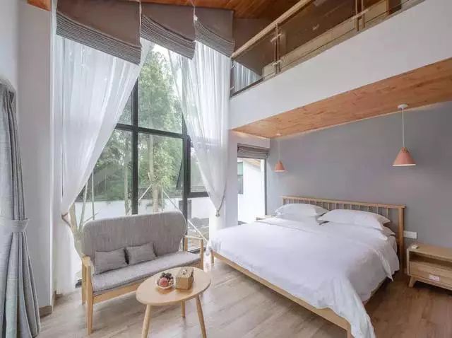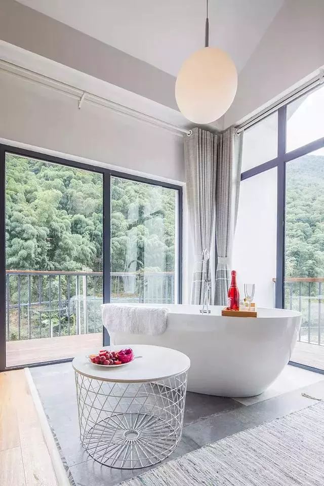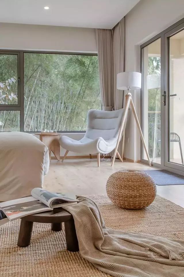 干净的白色、几何形状的造型,透了一股小清新范儿,与竹林清溪相映成趣。除了溪流,对面还有一整座青翠的山林,房间的每一扇窗都给你一片绿色的心情。
