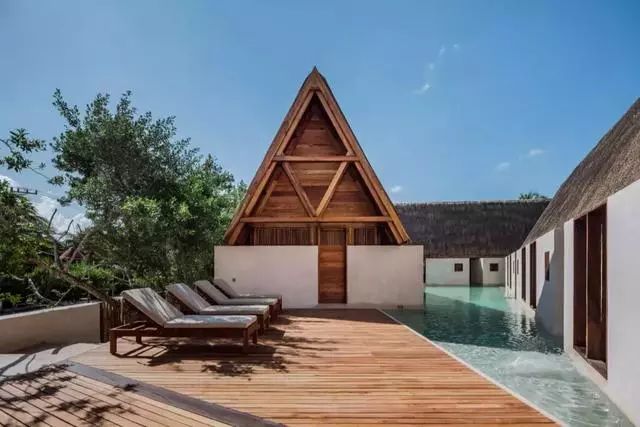 Punta Caliza的设计理念是对玛雅建筑的现代、更几何的诠释。三角形的水池是该房产的中心焦点,类似于传统的玛雅住宅的庭院。所有的屋顶都是整齐的茅草屋顶,这是整个岛屿的一个共同特点,有助于维持其真正的玛雅遗产。