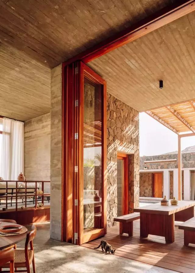 为确保别墅不打断景观,又希望客人有最大限度的广阔海景和自然光,每座建筑都围绕着一个中央户外露台布置,露台配有游泳池和厨房区域。空间前面的大块木制隔断可以旋转,以减少通常吹过该地区的强风。