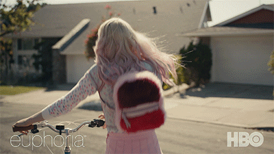比起 Zendaya 饰演的 Rue,女二 Jules 的出现,才是真正地点亮了整部剧。一个穿着格纹短裙,背着毛茸茸双肩包的年轻女孩骑着自行车,在空旷的马路上飞驰,她就像是美少女战士中的水冰月一样,闪亮登场了。