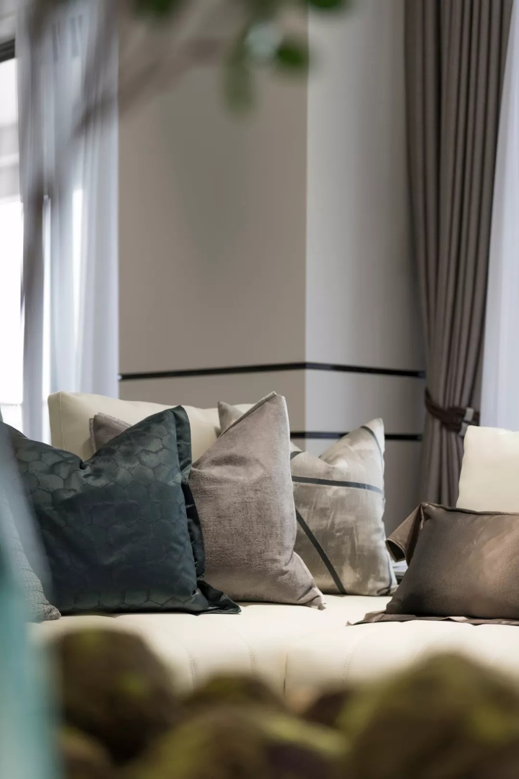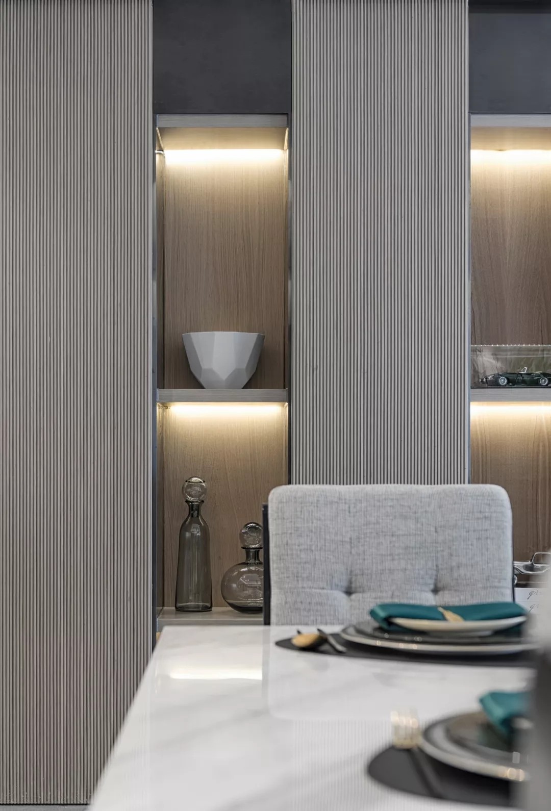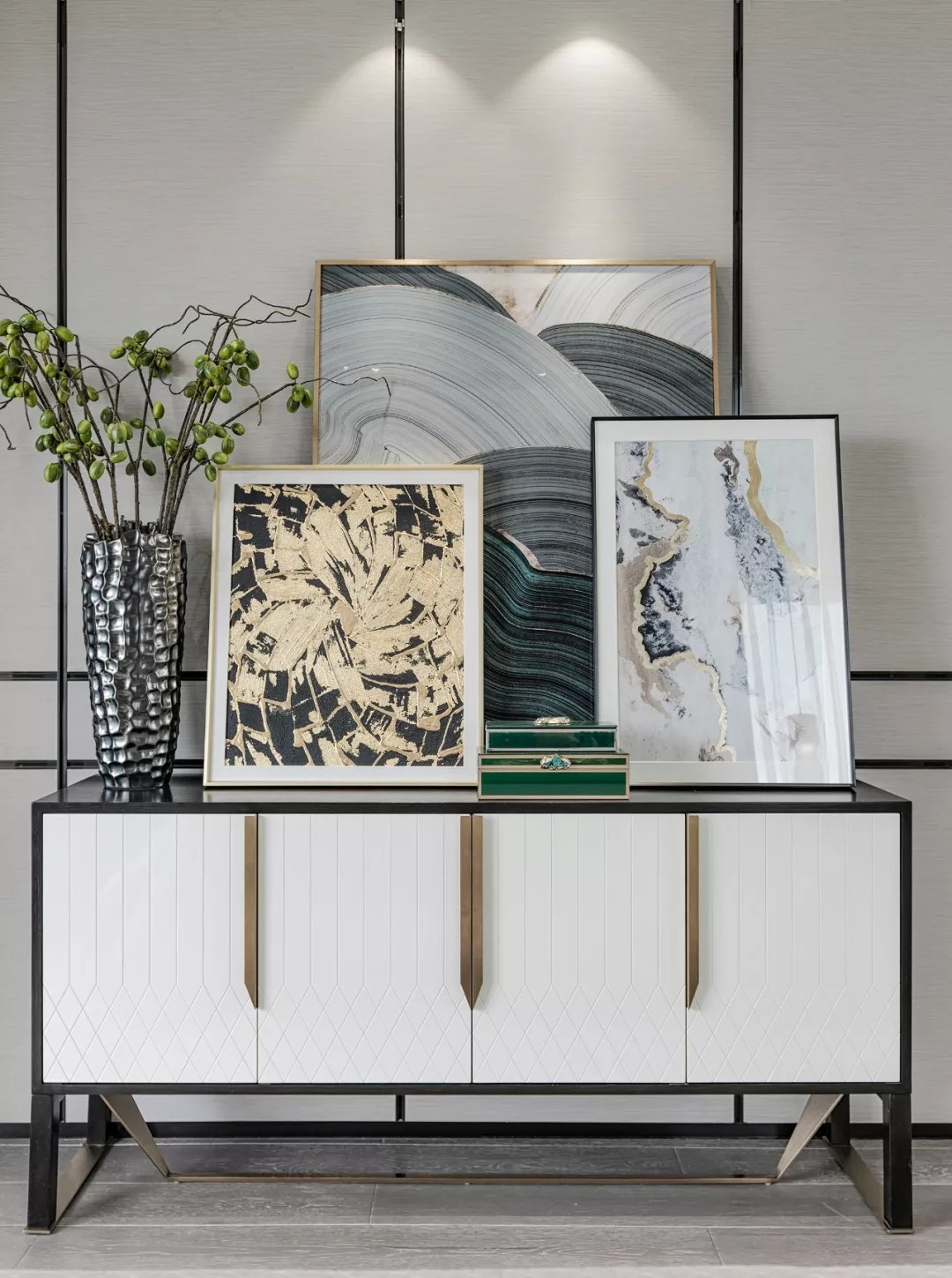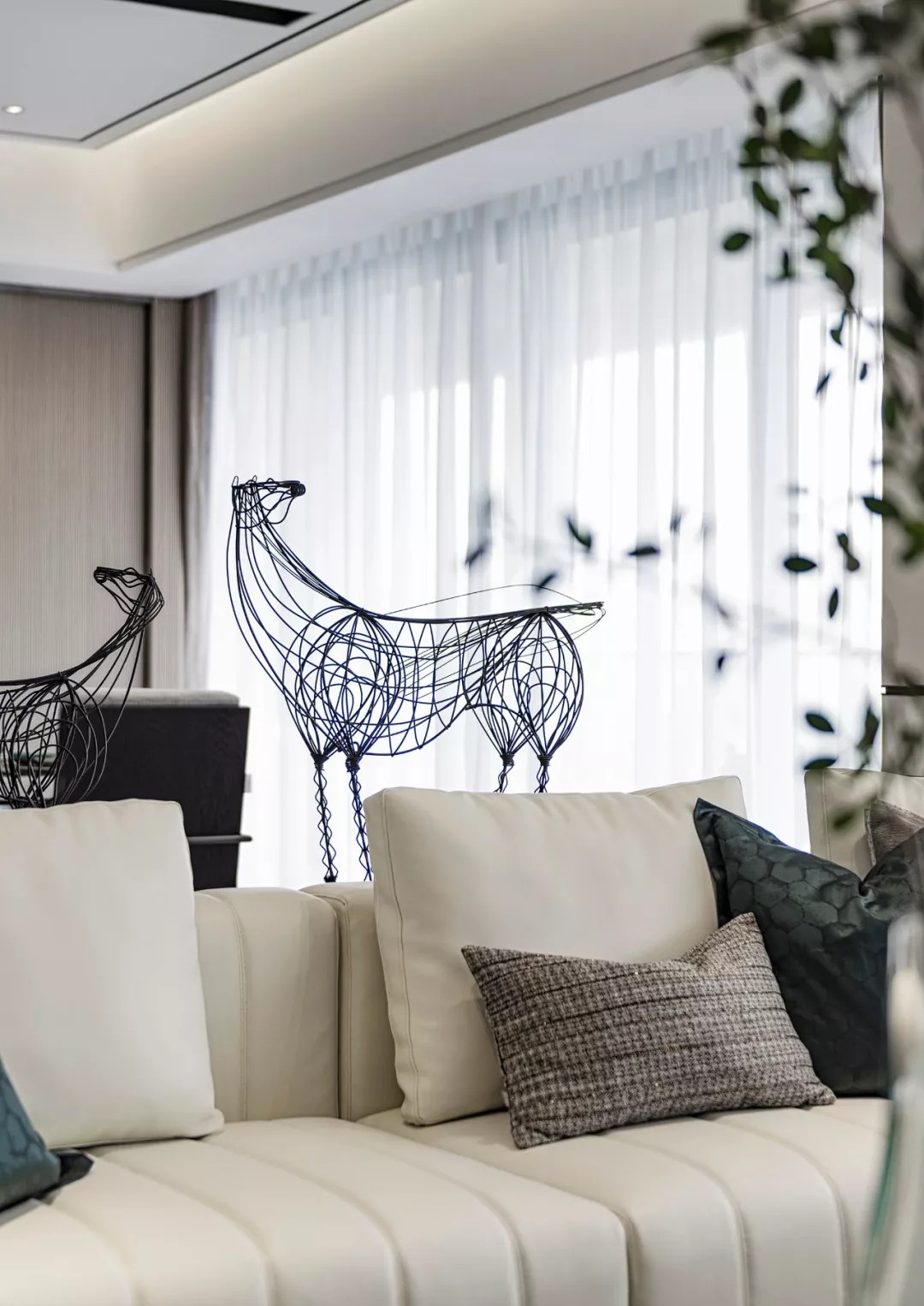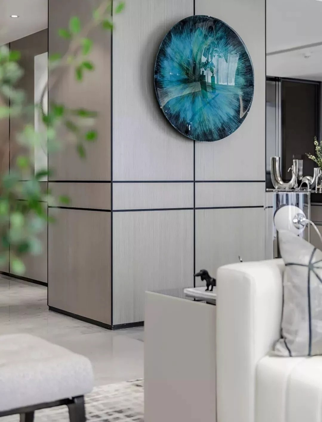 空间质感体现在细微处 这些细节并非指反复的雕花 或者多种材质的堆叠 反倒是极其简约的线条与 简单却不匮乏的几何拼接 更能凸显出家的优雅 充满现代感的艺术挂画与雕塑 配以家具硬朗、流畅的线条 共同展现空间恢弘大气的格局