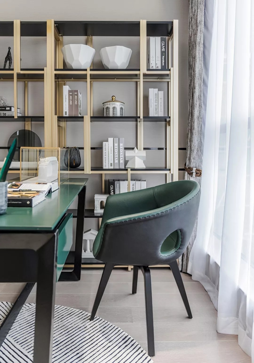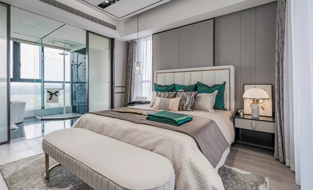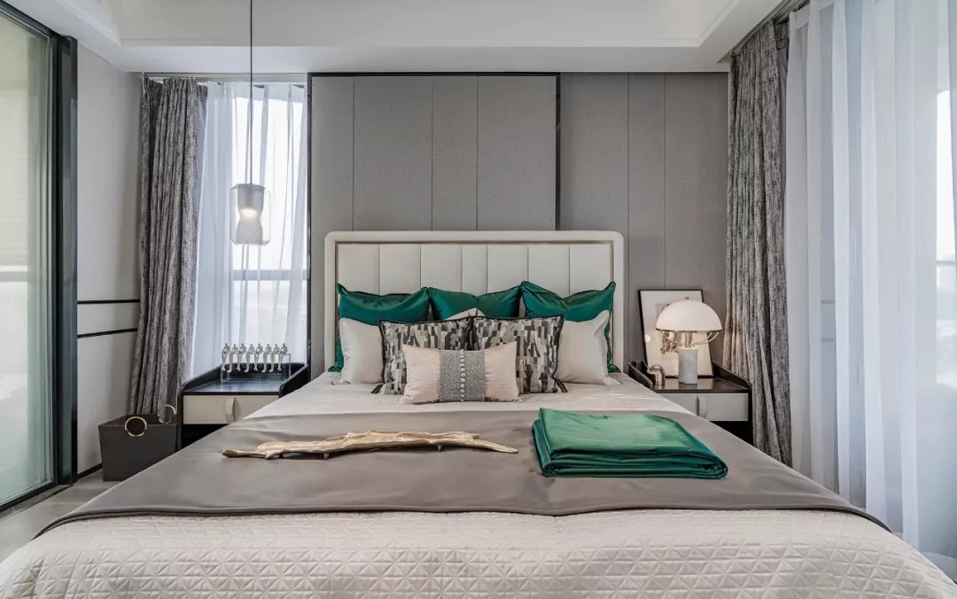 卧室的设计浸透着轻松的优雅 同样保持平和的色彩 祖母绿延续进卧室 显得更加婉约、纯净 像是从空间里生长出来色彩 不喧哗但又独具品味 恰如艺术与生活的完美邂逅 室内与外的阻隔 在色彩的营造下再次降低