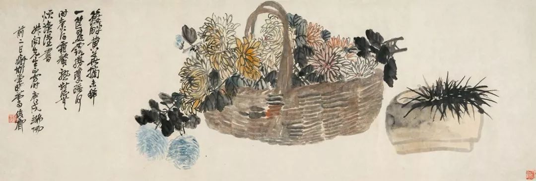 在吴昌硕众多菊花作品中,我们不难发现,设色轻盈的往往被安排在上部,设色深重或颜色自身基调重的会被安排在下半部。