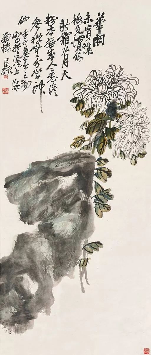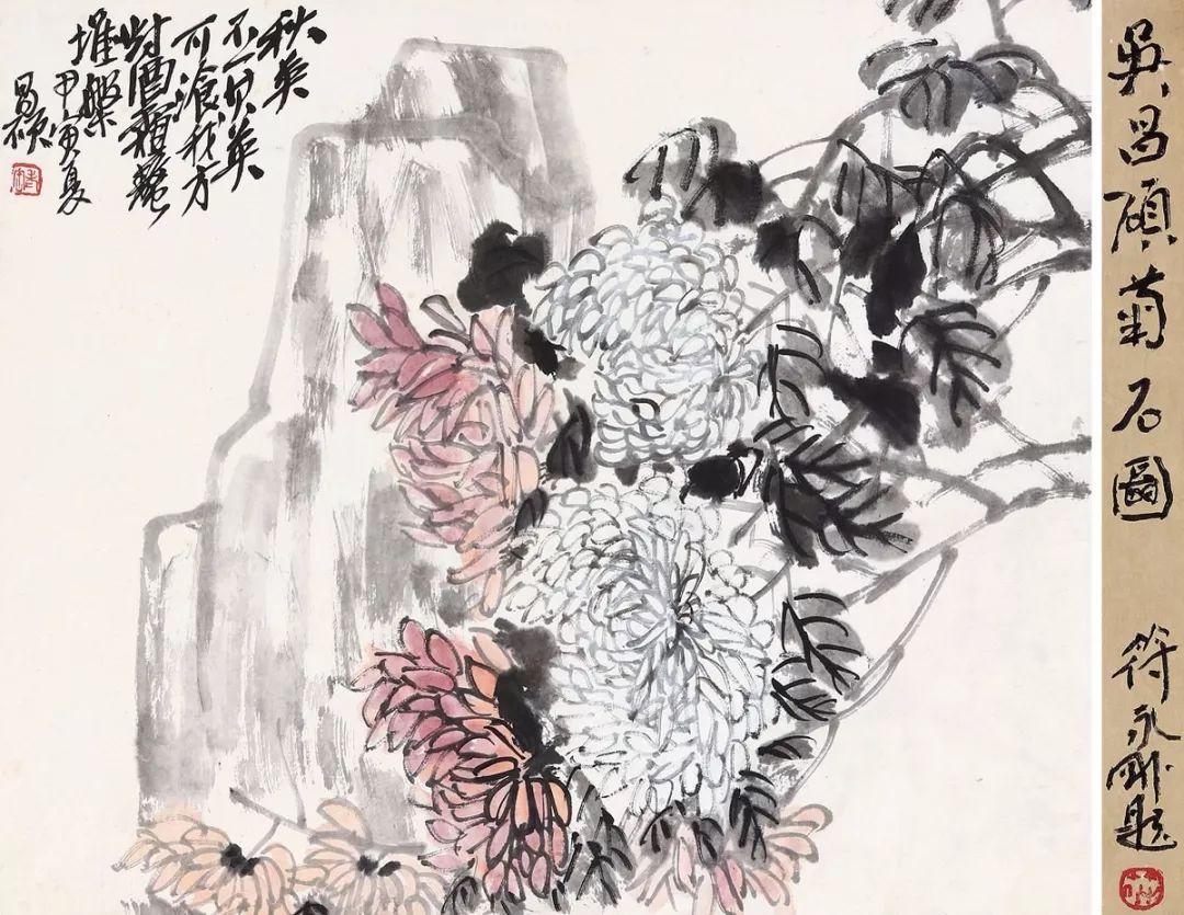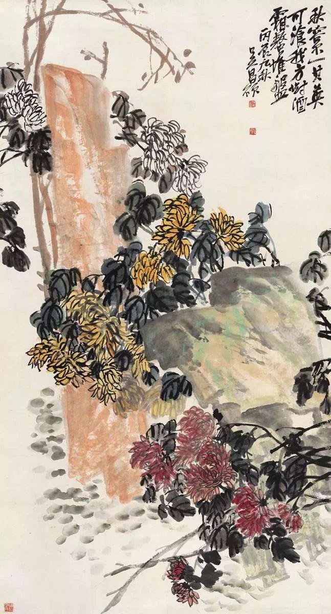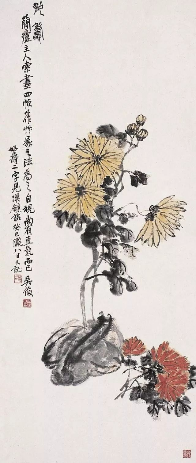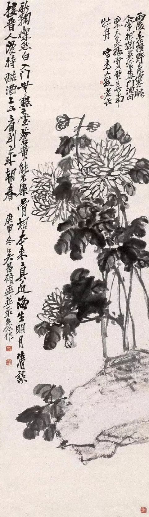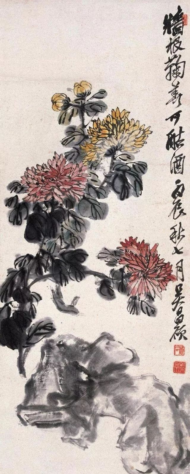 吴昌硕所作之菊,线条凝练遒劲,刚柔并济;墨色浓淡相间,不落俗格。并伴以山岩、野石、溪水,或插入孤高细瘦的古瓶,皆与秋菊幽独淡雅、冷逸傲世的情态相映成趣。